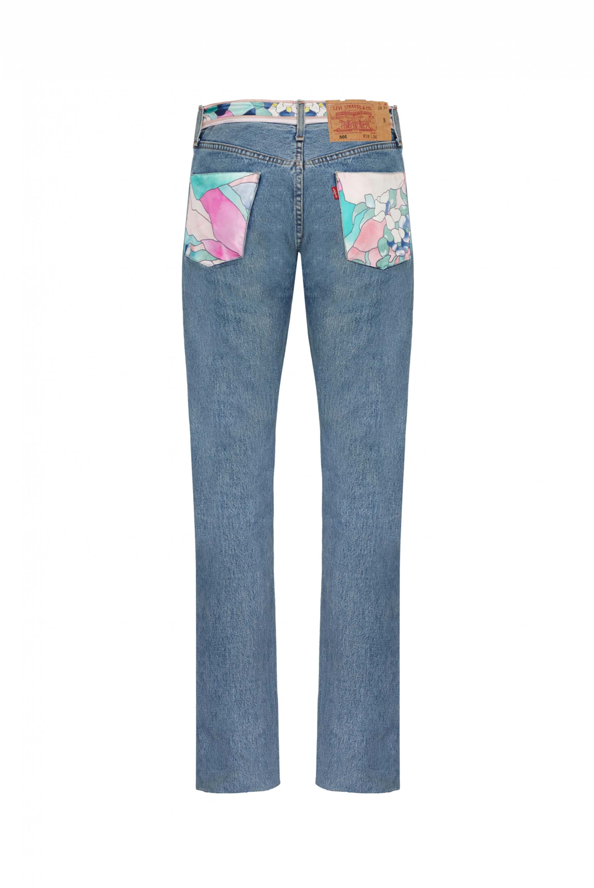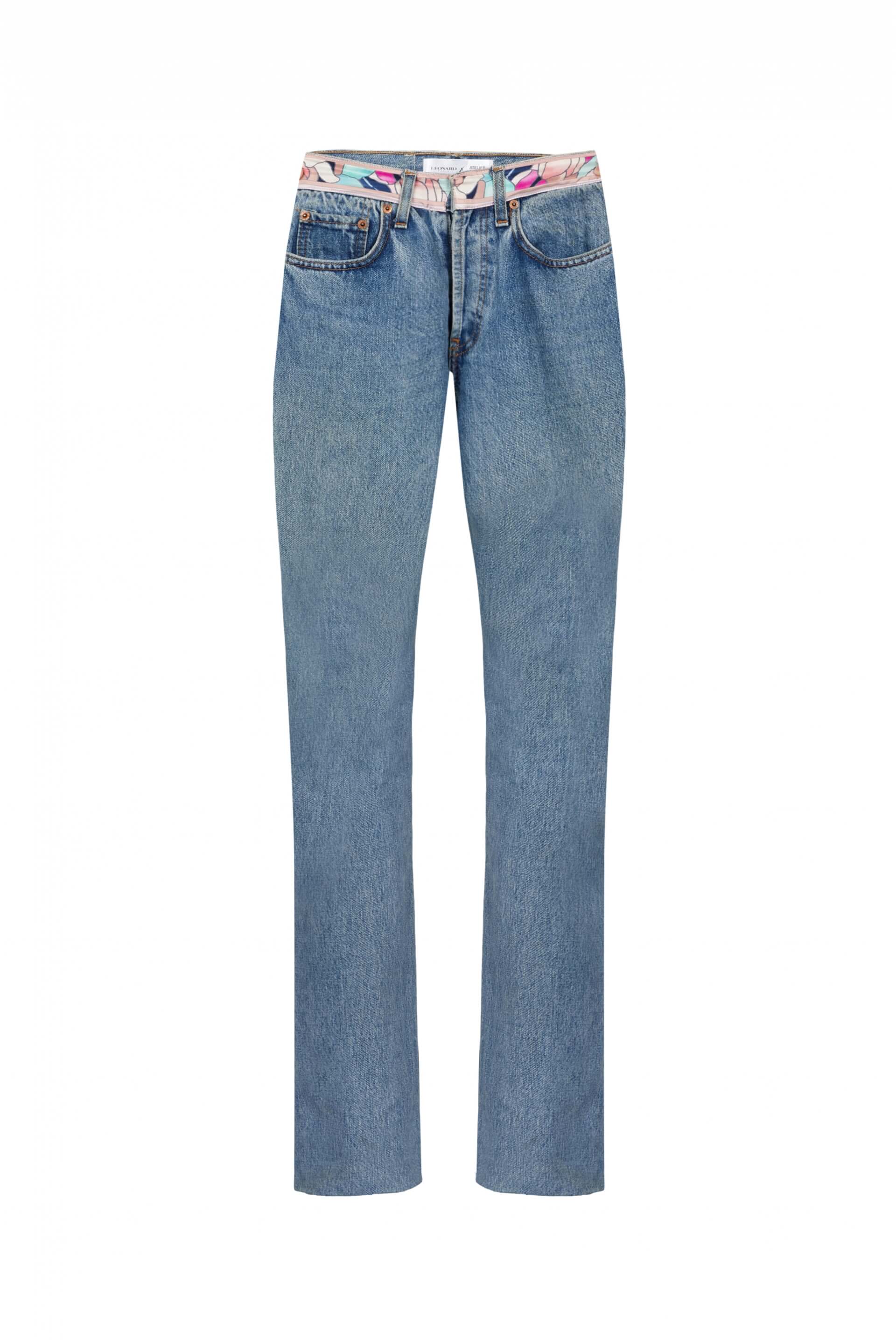 Upcycled jeans. Unique piece customised with silk jersey fabrics from the Leonard archives. 100% Made In Paris.Length: 102cm; Hip measurement: 86cm; Waist measurement (low): 70cm - Non-stretch - 100% cotton