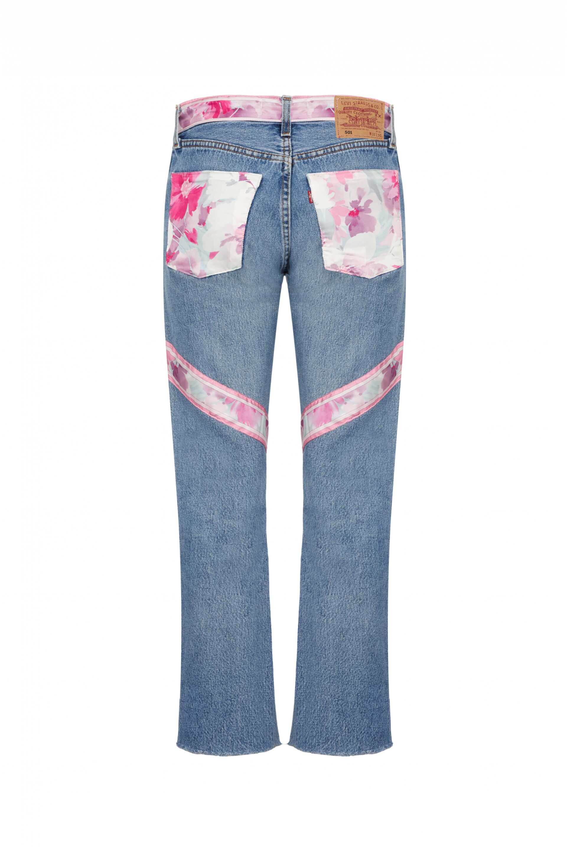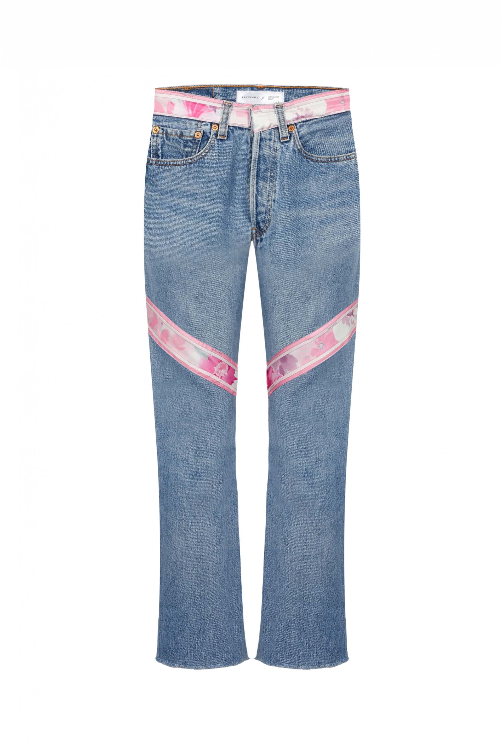 Upcycled jeans. Unique piece customised with silk jersey fabrics from the Leonard archives. 100% Made In Paris. Length: 91cm; Hip measurement: 90cm; Waist measurement (low): 64cm - Non-stretch - 100% cotton