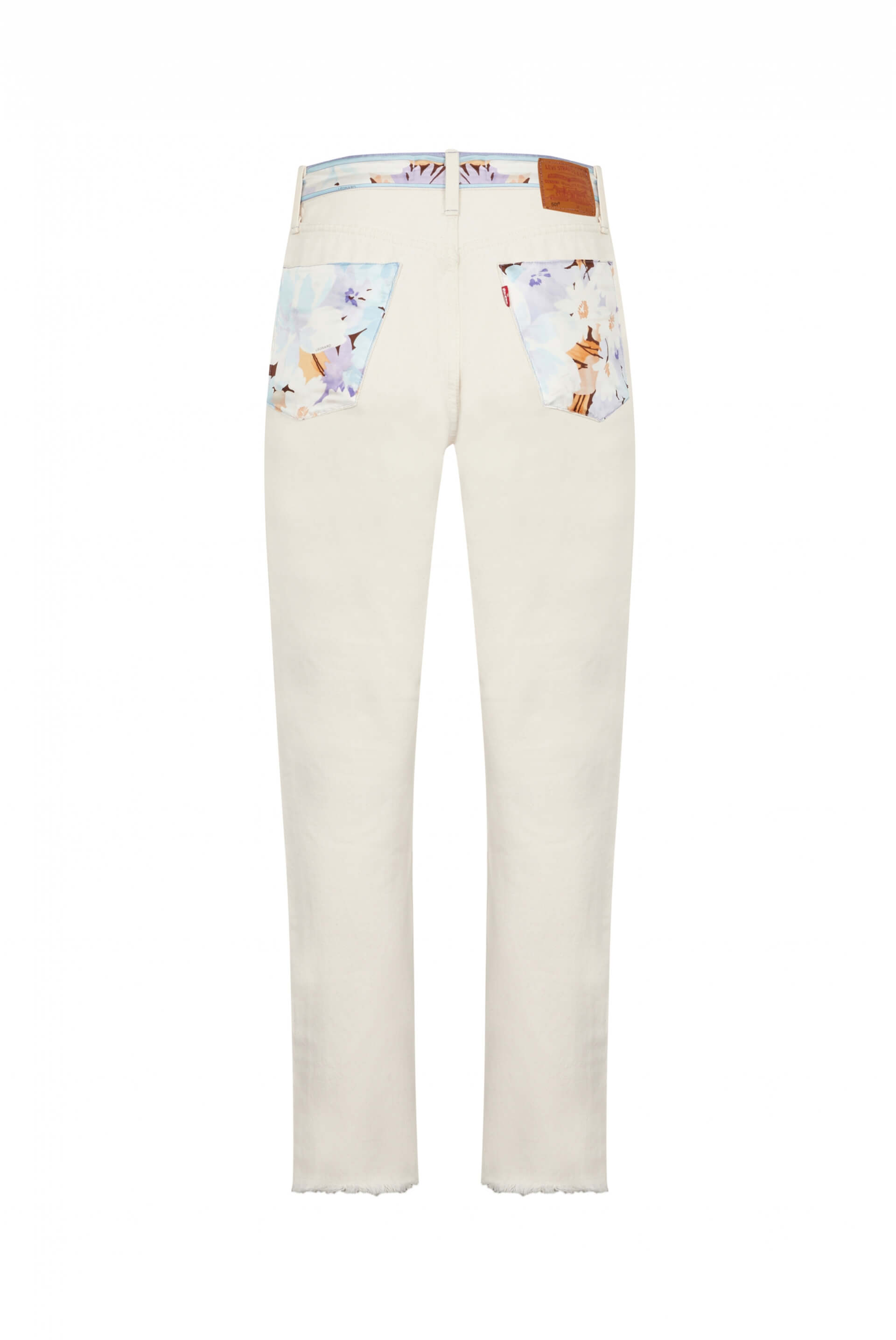 Upcycled jeans. Unique piece customised with silk jersey fabrics from the Leonard archives. 100% Made In Paris. Length: 98cm; Hip measurement: 88cm; waist measurement (low): 70cm - Non stretch - 100% cotton
