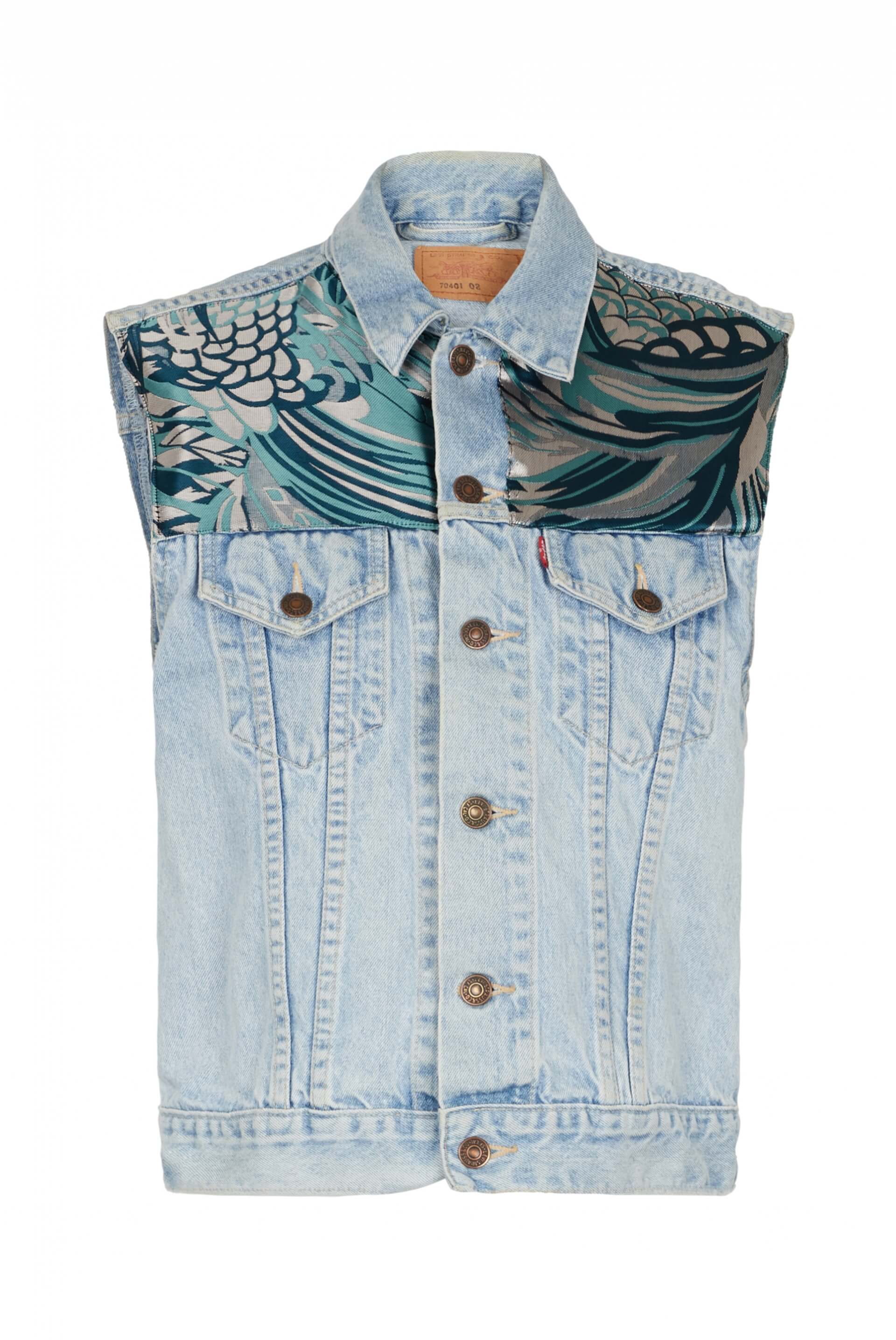 Upcycling sleeveless denim jacket. A unique piece customised from silk jersey fabrics from the Leonard archives. 100% Made In Paris. Waist measurement: 106cm Chest measurement : 100cm Back length: 62cm