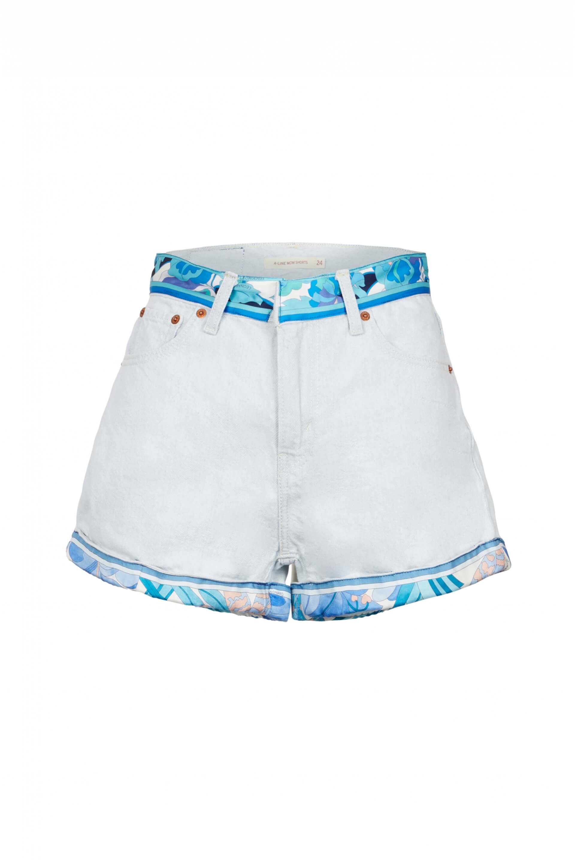 Upcycled denim short. Unique pied customised with silk jersey fabrics from the archives of the Maison Leonard. 100% Made In Paris. Length: 39 cm Waist measurement (high): 70 cm Hip measurement: 92 cm