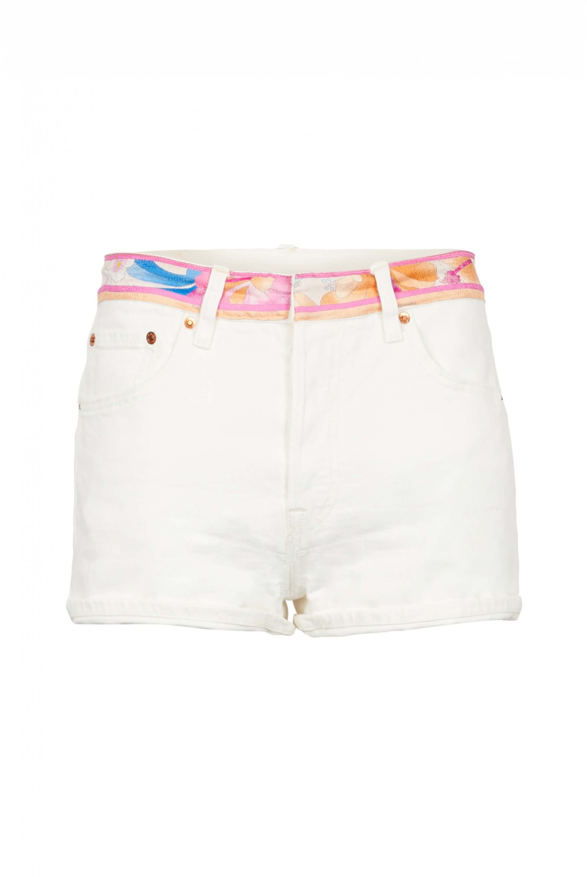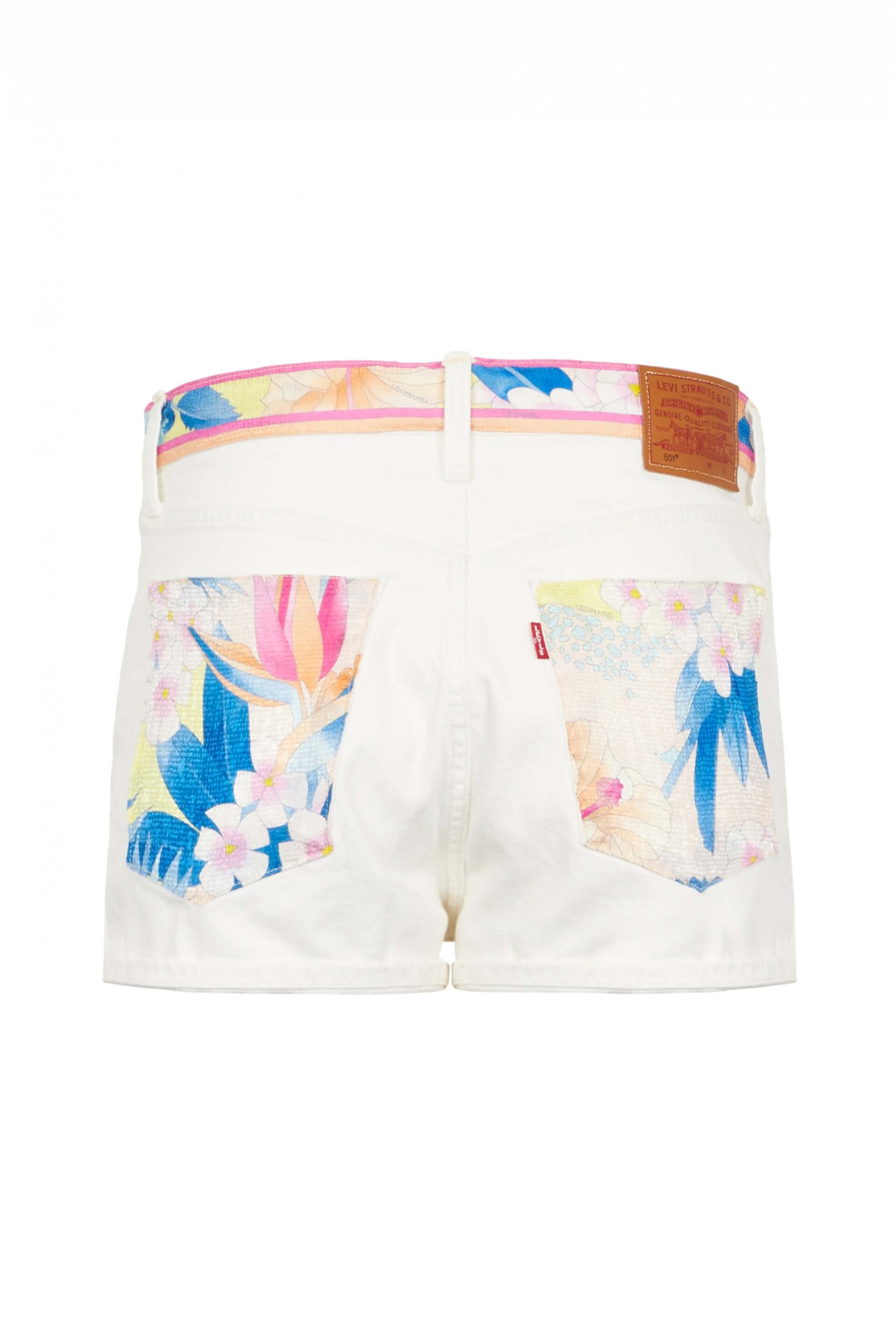 Upcycled denim short. Unique pied customised with silk jersey fabrics from the archives of the Maison Leonard. 100% Made In Paris. Length: 38 cm Waist measurement (high): 78cm Hip circumference: 90cm