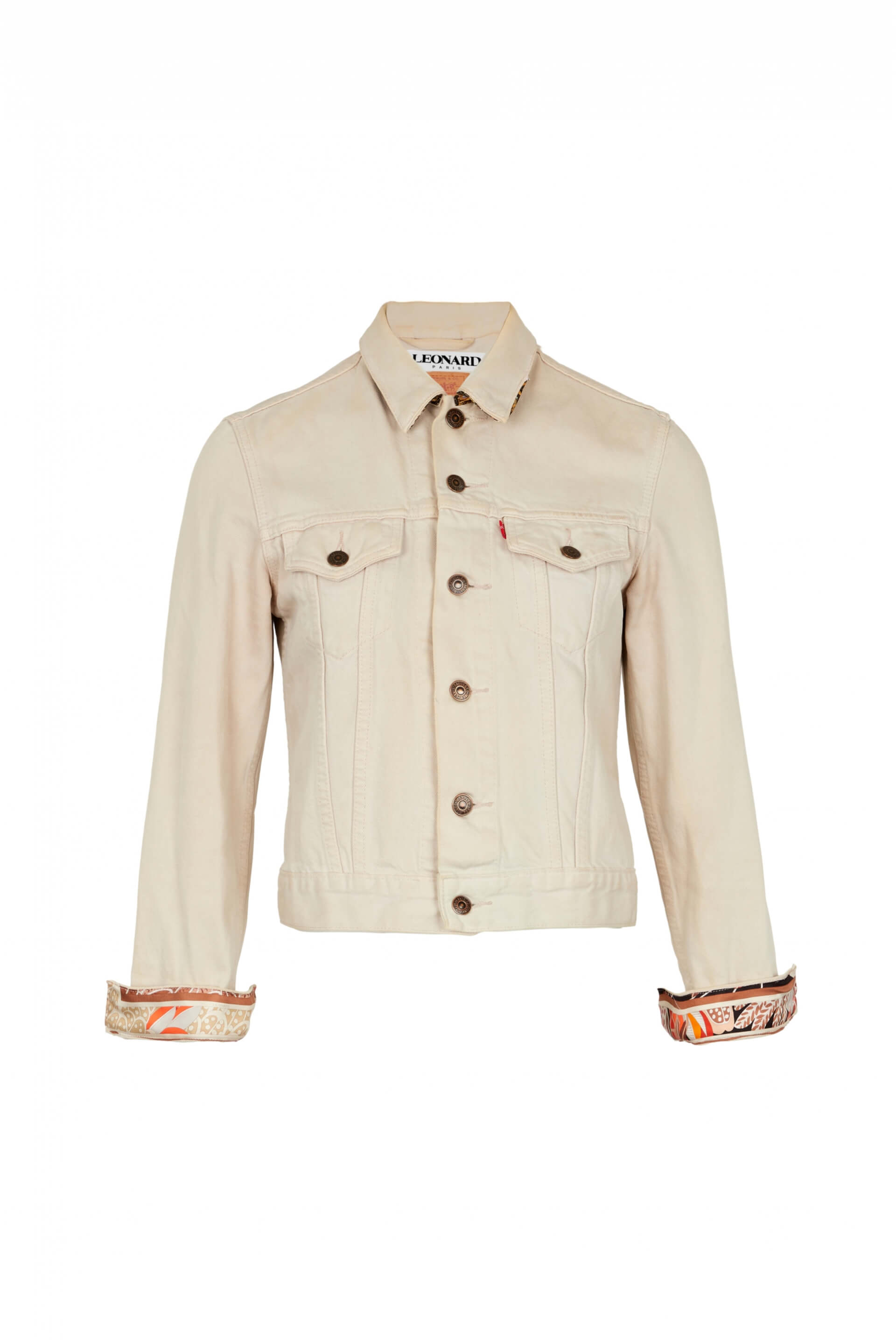Upcycled denim jacket. Unique piece customised with silk jersey fabrics from the Leonard archives. 100% Made In Paris. Waist measurement: 72cm Chest measurement: 78cm Sleeve length: 58cm Back length: 51cm