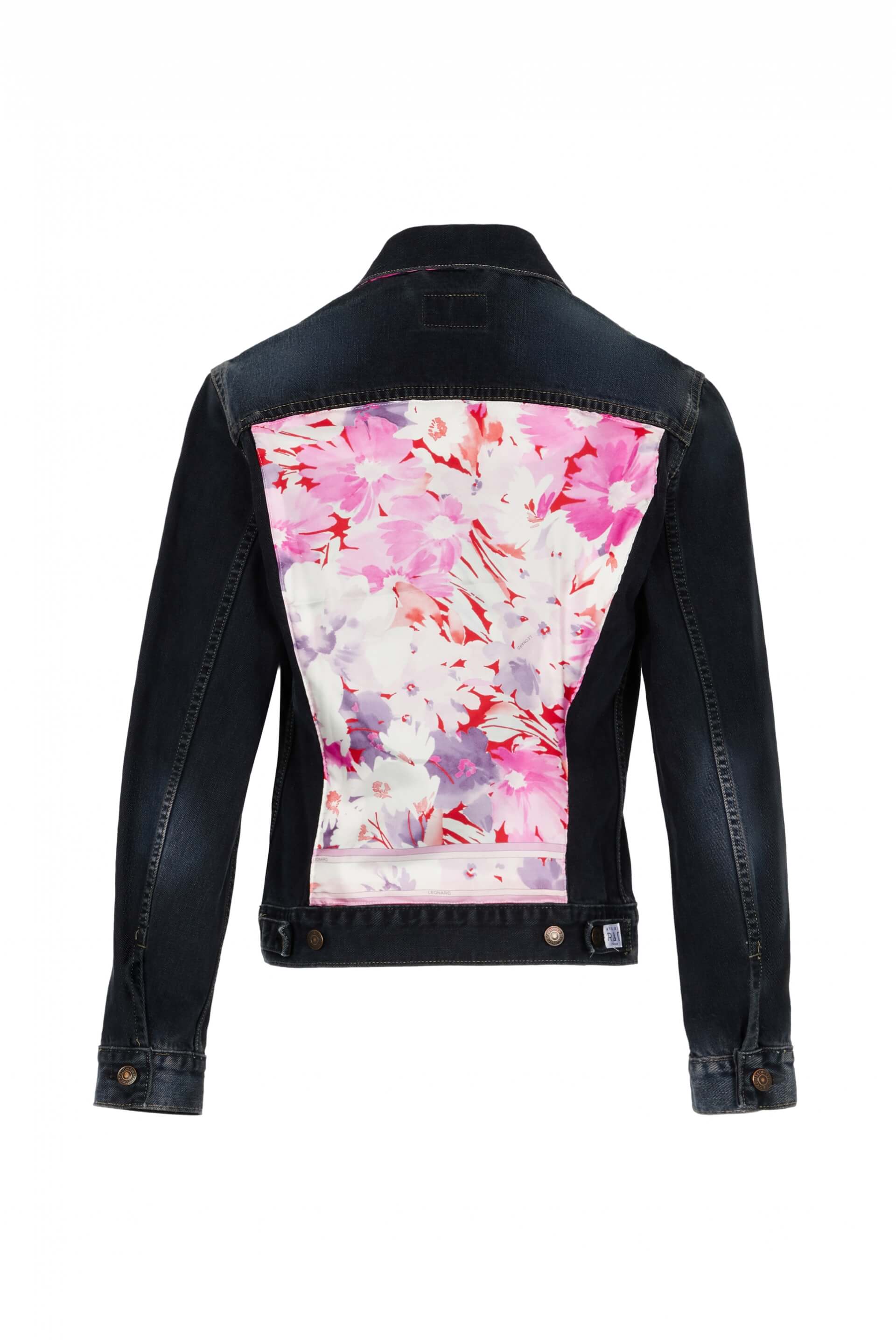 Upcycled denim jacket. Unique piece customised with silk jersey fabrics from the Leonard archives. 100% Made In Paris. Waist measurement: 86cm Chest measurement: 82cm Sleeve length: 62cm Back length: 58cm