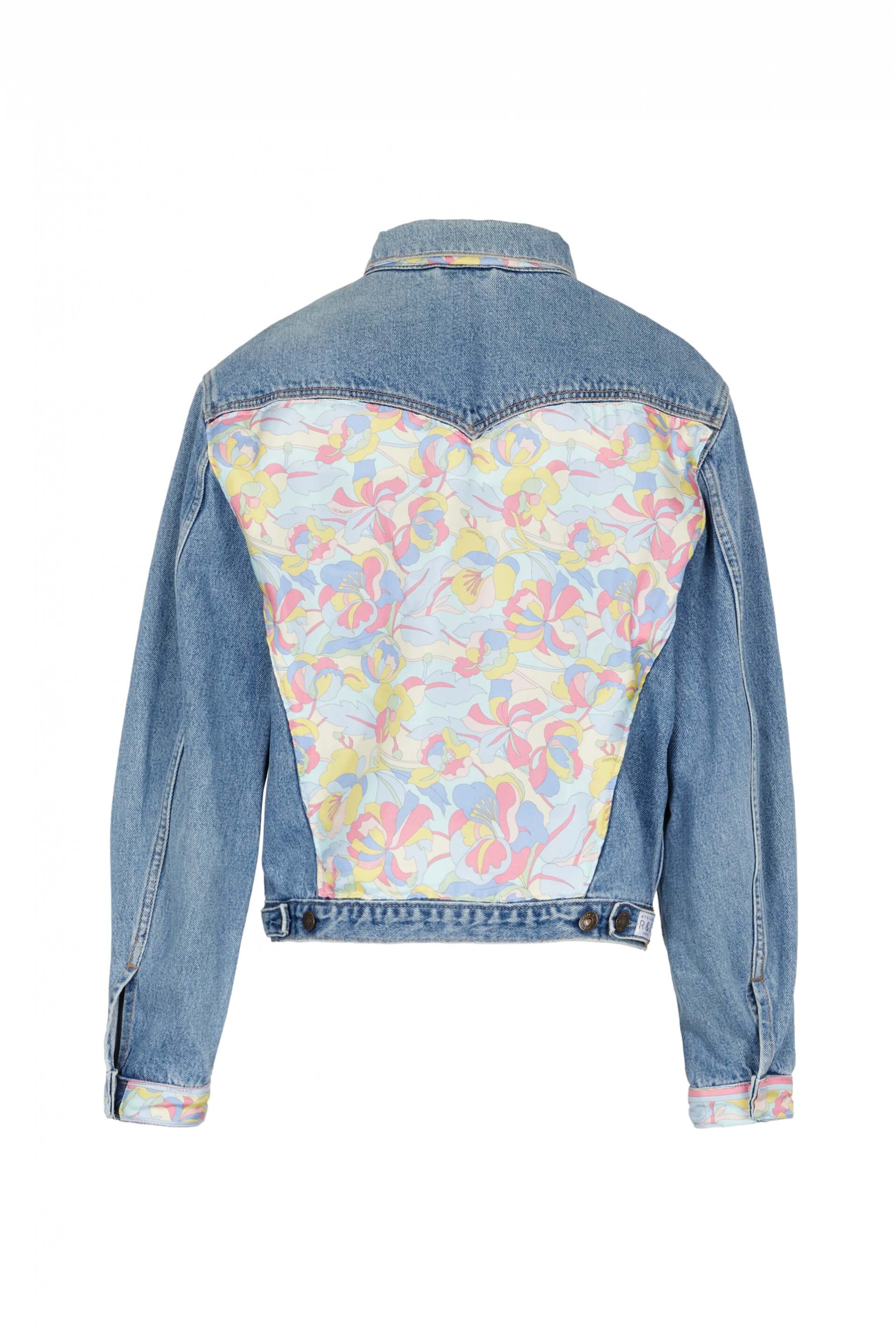 Upcycled denim jacket. Unique piece customised with silk jersey fabrics from the Leonard archives. 100% Made In Paris. Waist measurement: 96cm Chest measurement: 100cm Sleeve length: 60cm Back length: 53cm