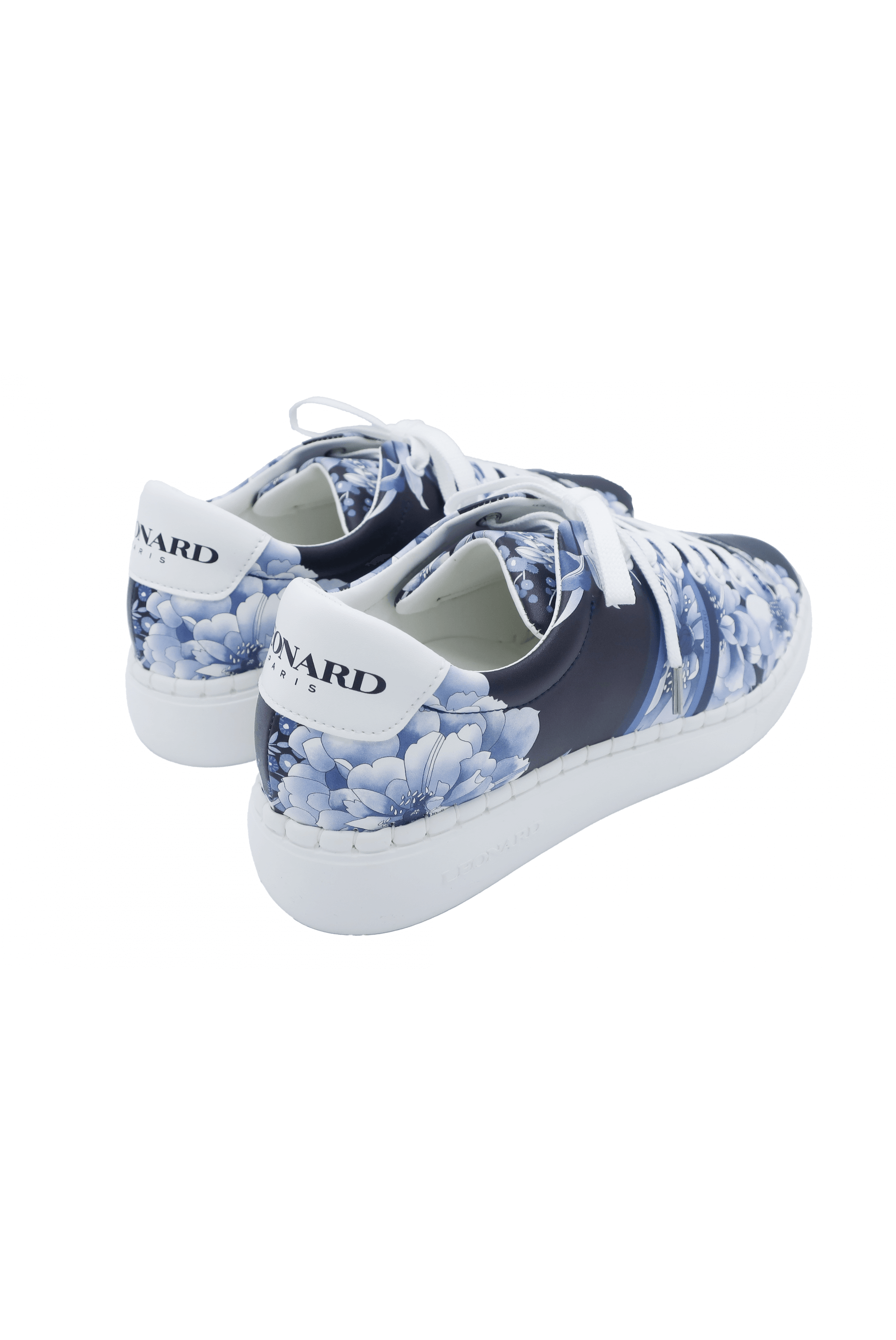 Baskets bleues à imprimé fleuri.