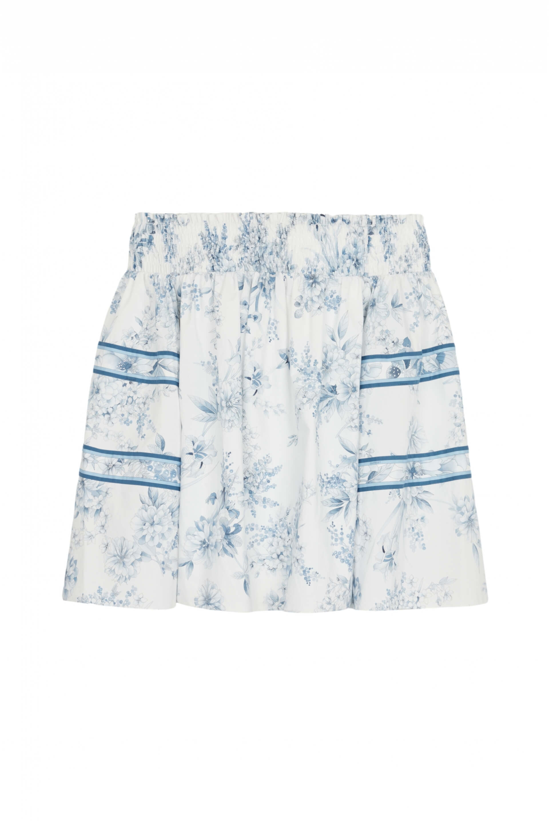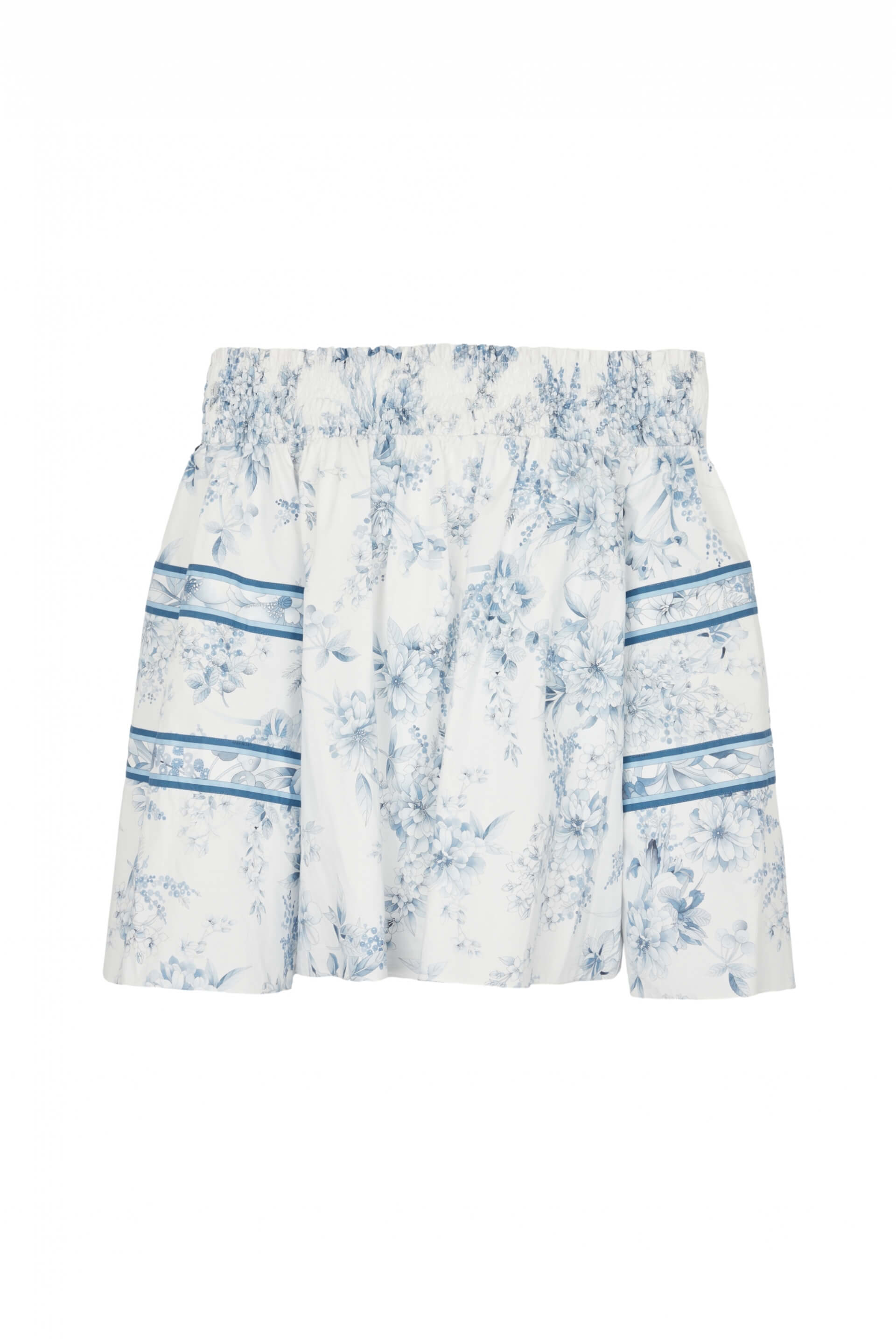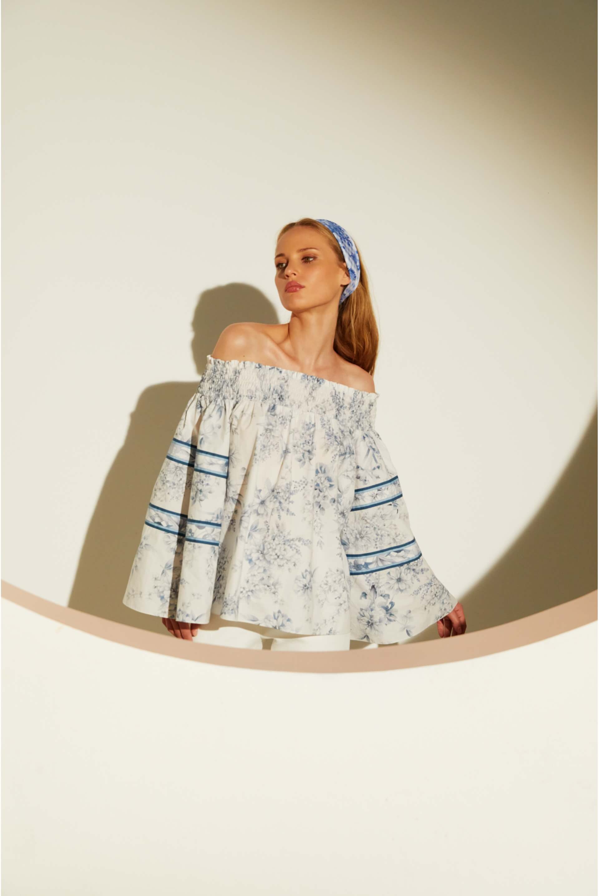 Top bustier à manches longues pagodes. Imprimé fleuri relevé de bandes emblématiques LEONARD sur les manches. Tailles françaises. Fabriqué en Italie.