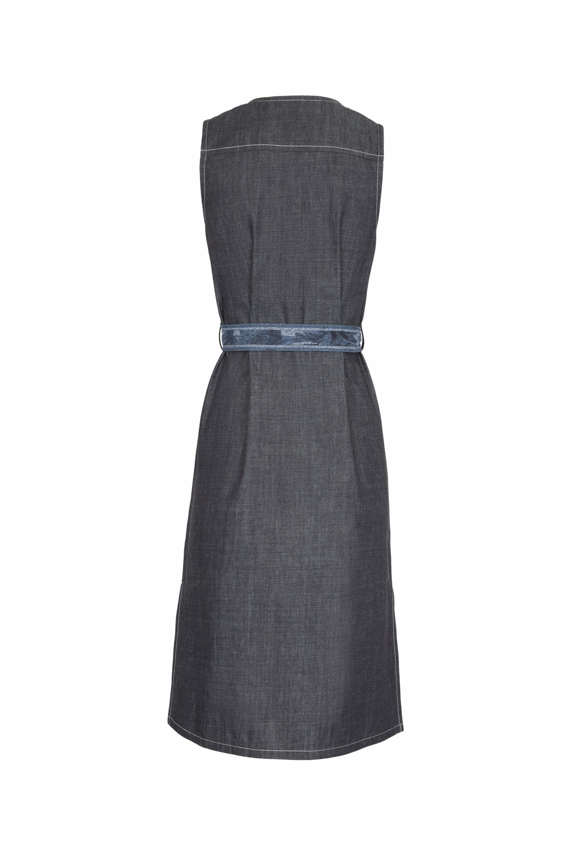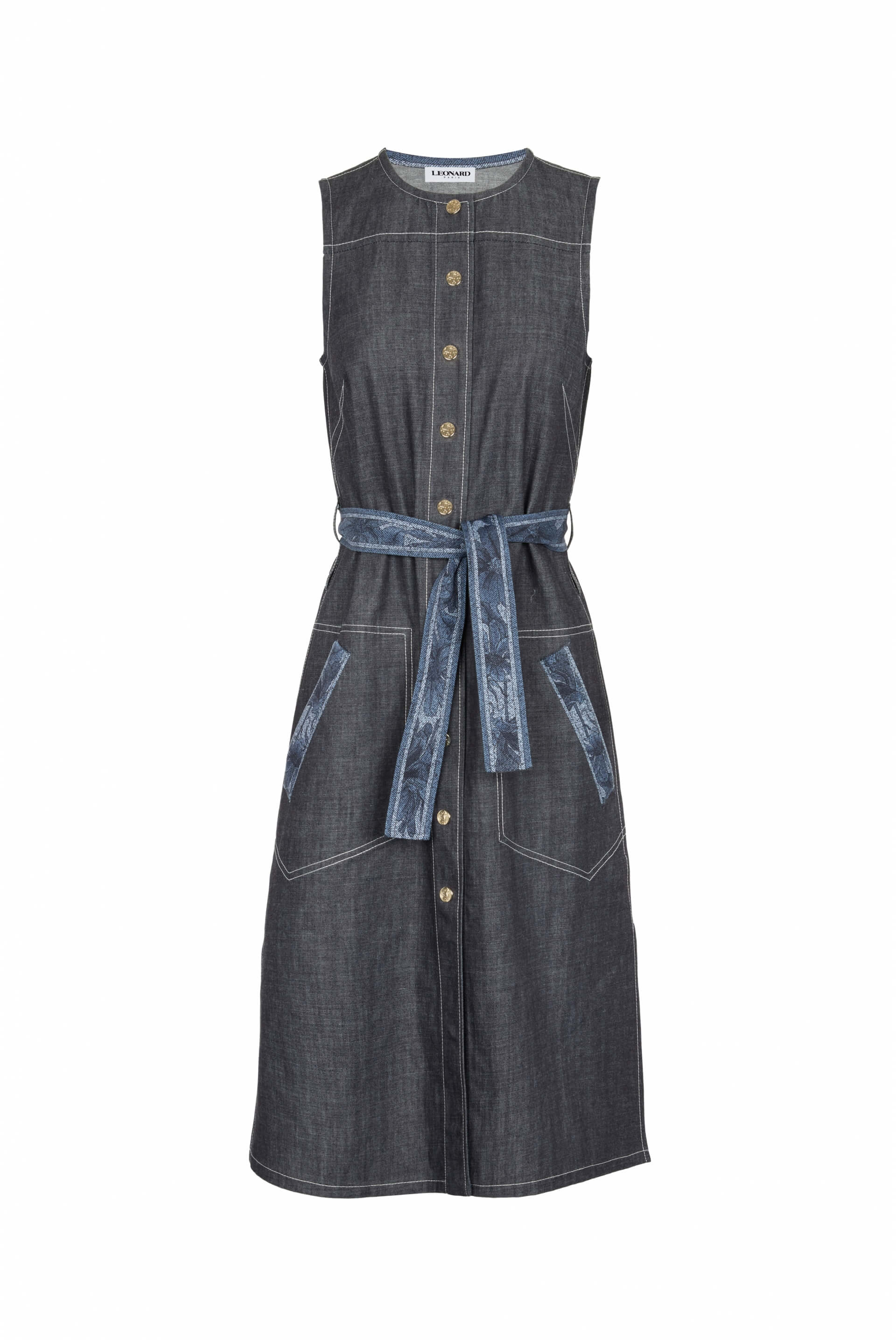 Longue veste sans manches en jean ceinturée à la taille, dôtée de détails imprimés sur les poches avant. Longueur : 112cm. Tailles françaises. Fabriquée en Italie.