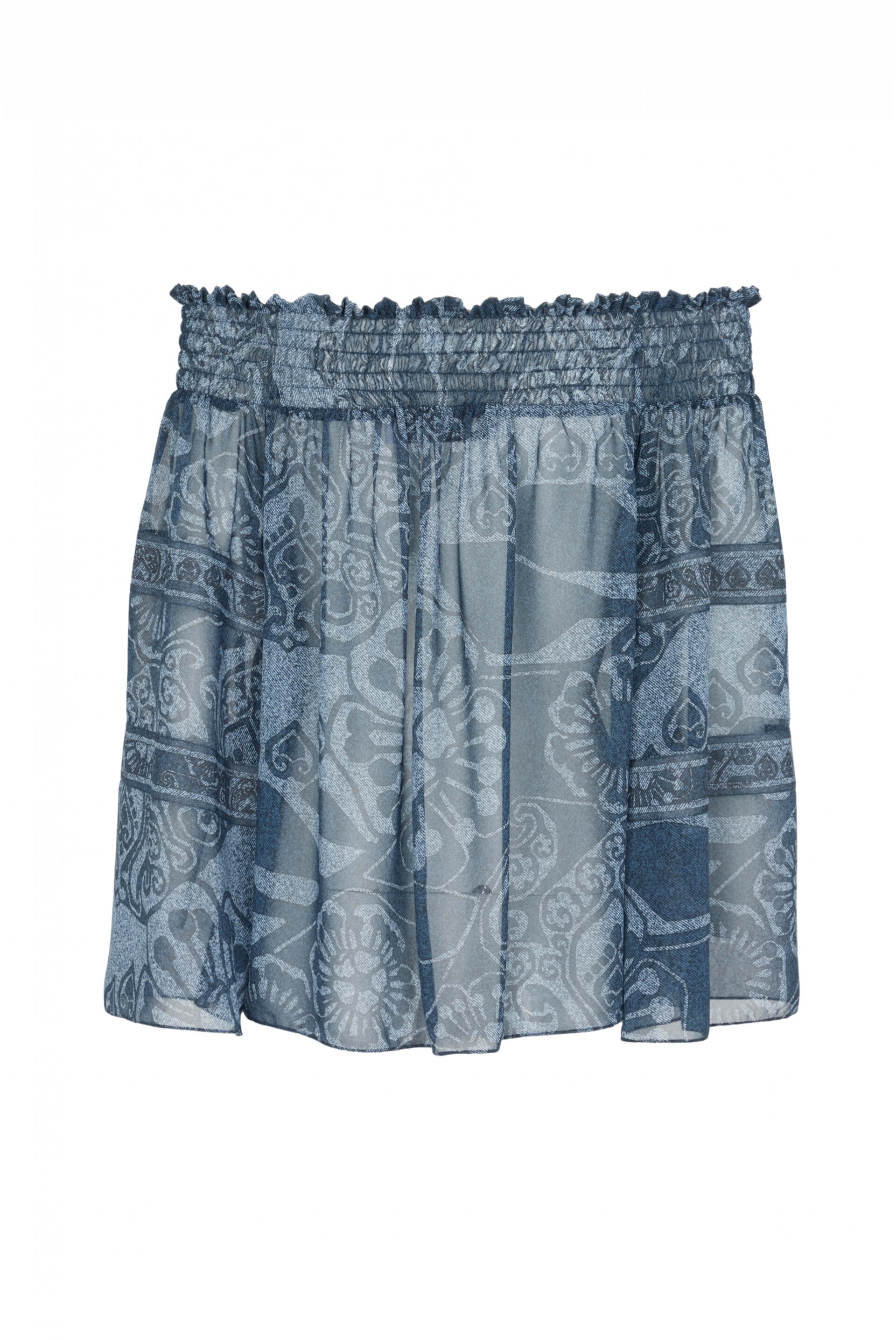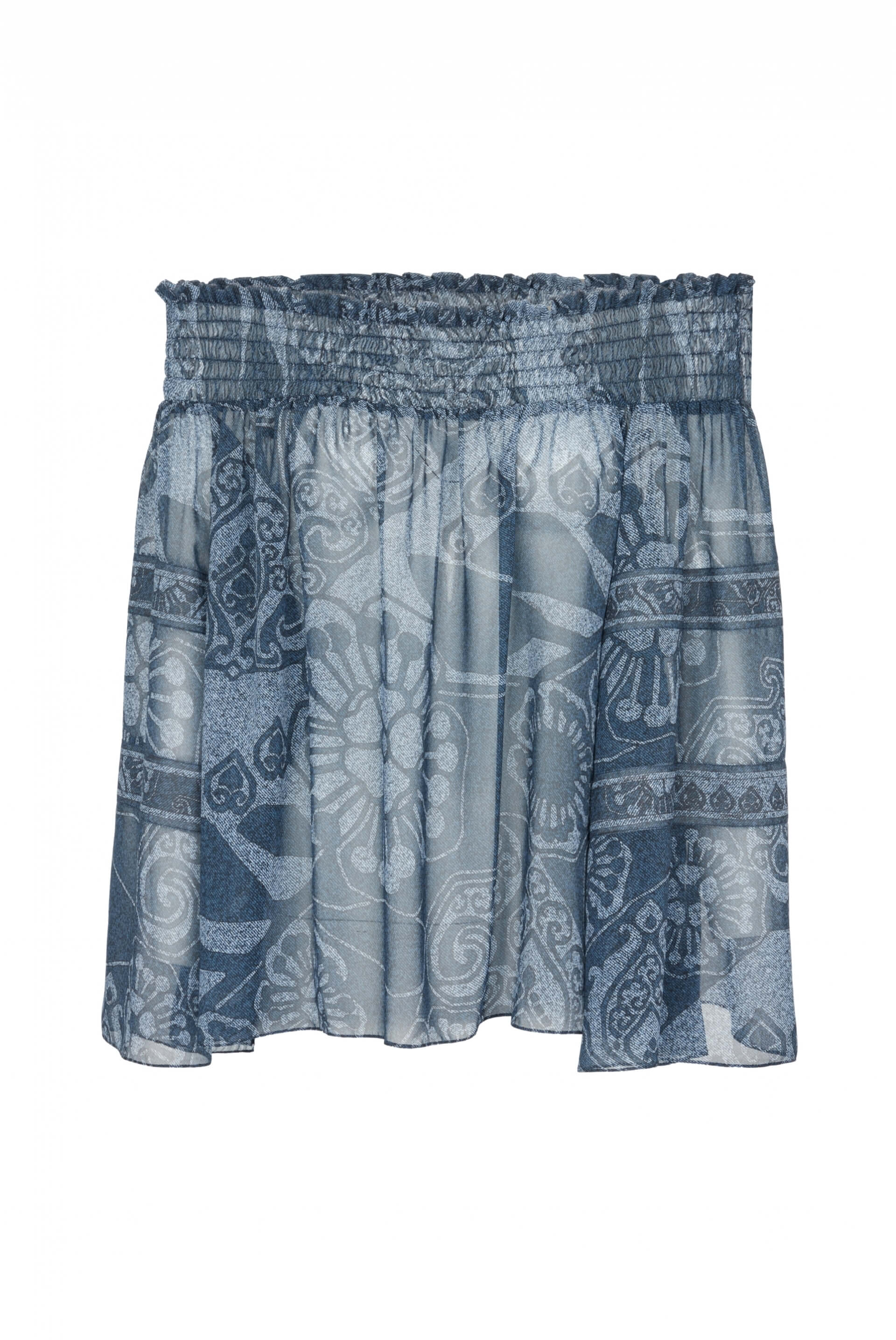 Blouse col bardot à encolure smockée. Matière transparente. Longuer : 64cm. Tailles françaises. Fabriquéee en Italie.