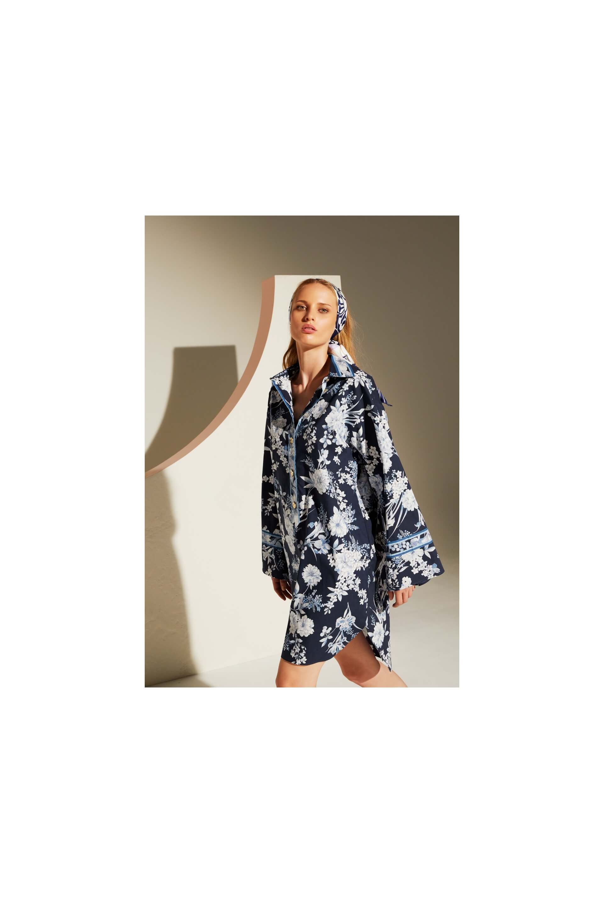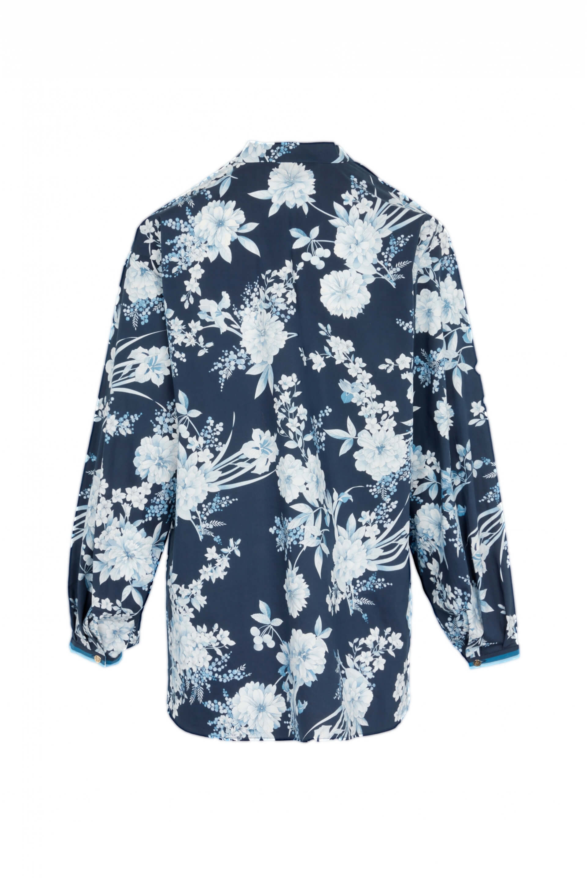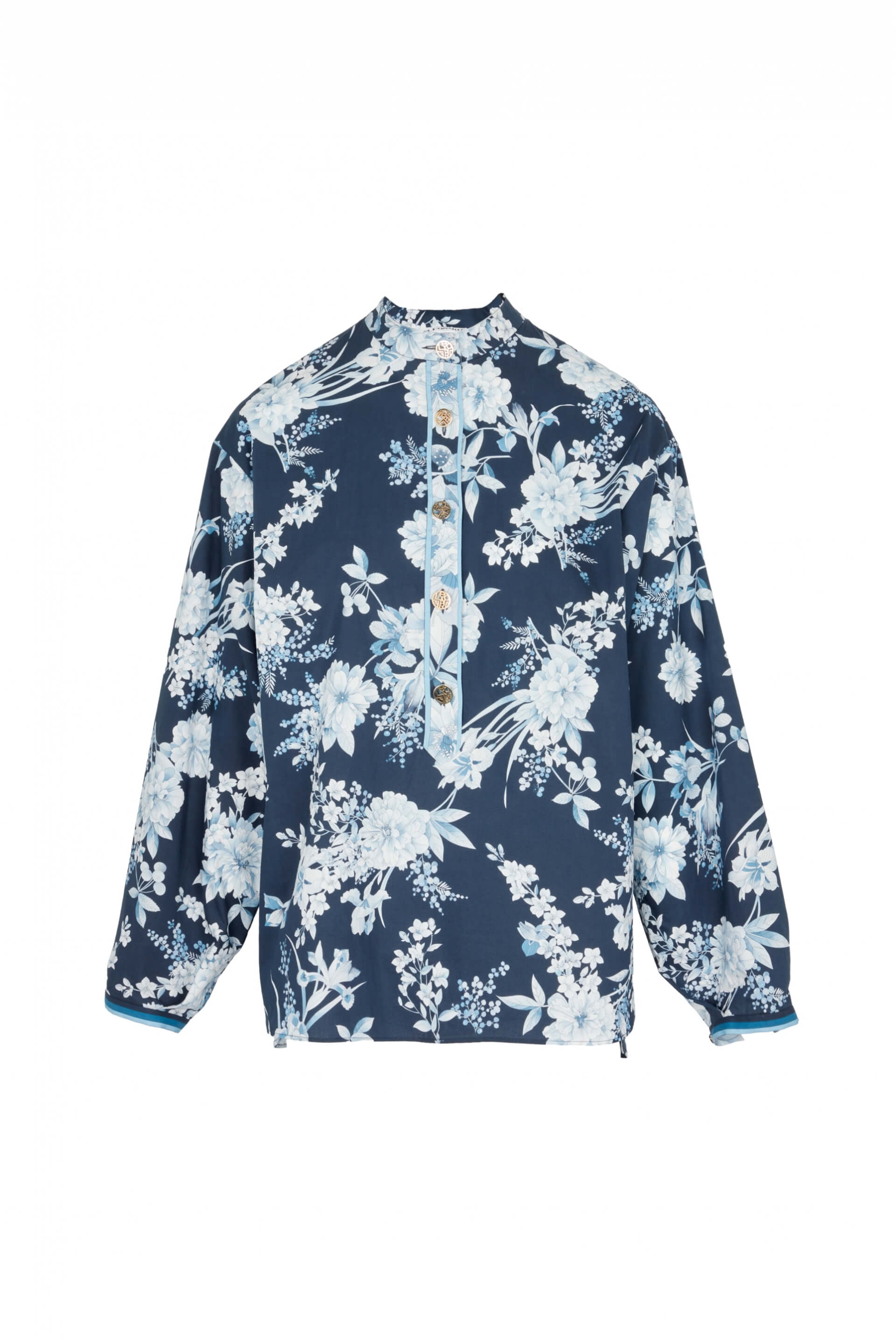 Tunique imprimée à boutons métallisés. Longueur asymétrique. Longueur avant : 66cm Longueur dos : 76cm pour toutes les tailles. Tailles françaises. Fabriquée en Italie.