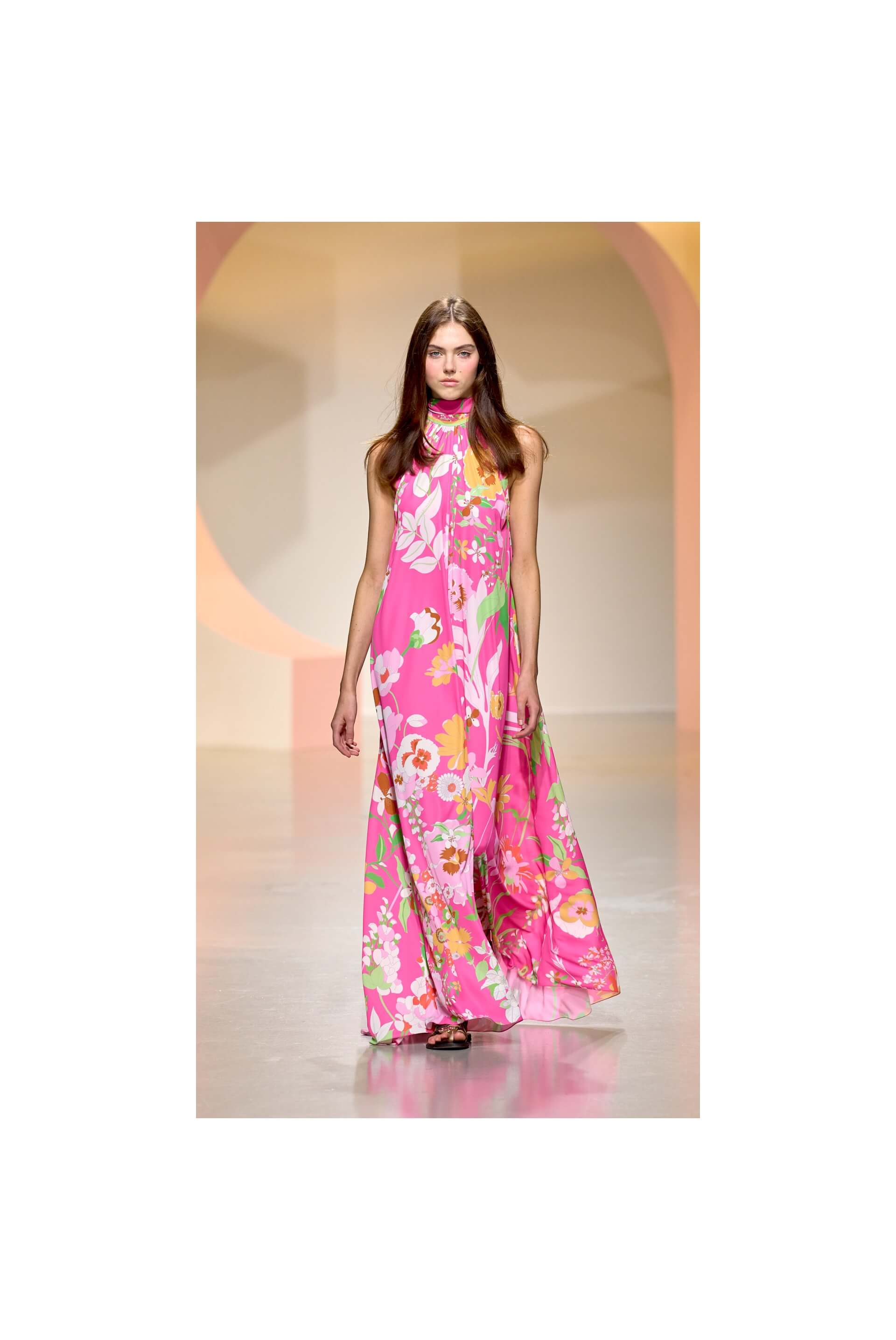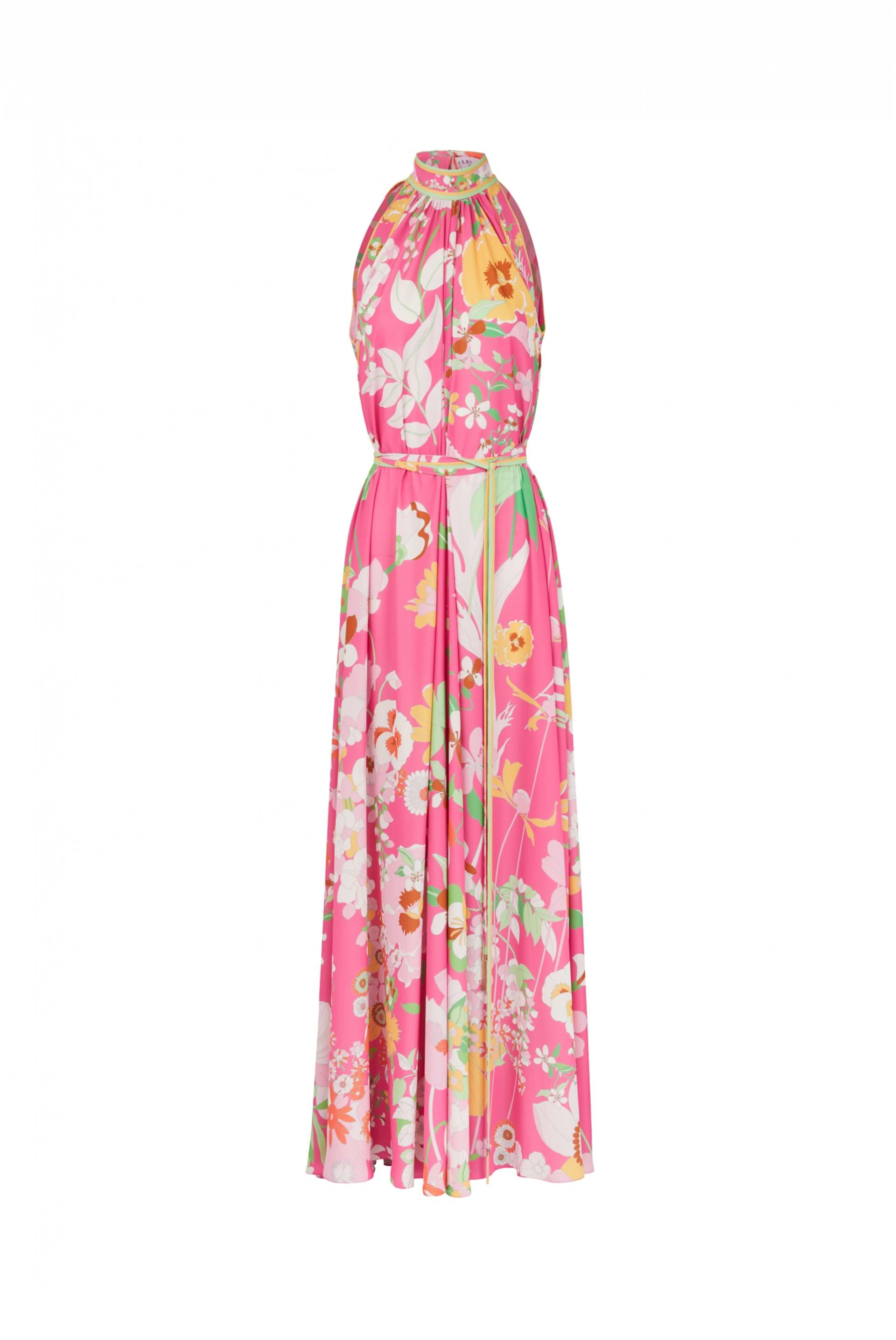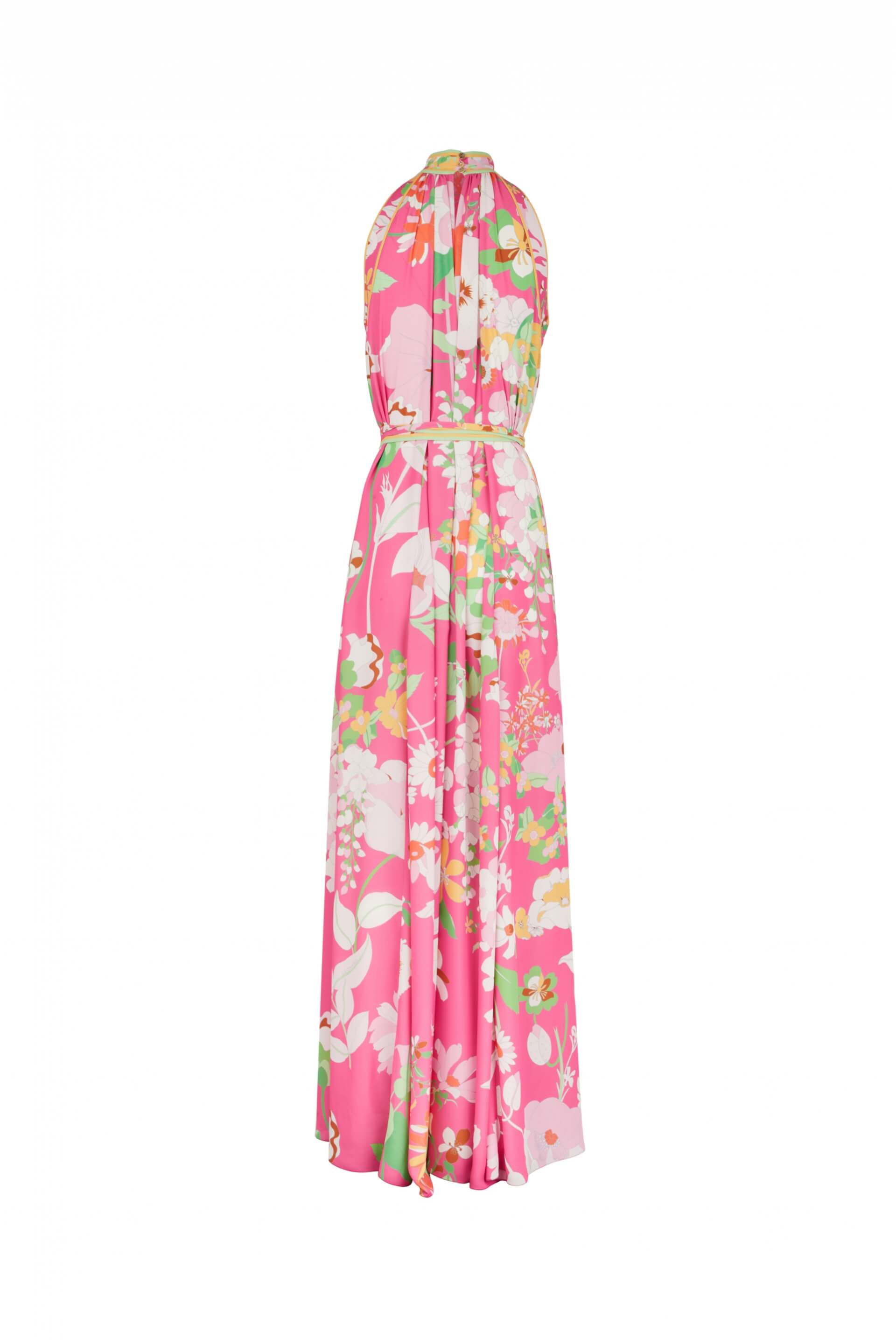 Robe longue fluide sans manche à col montant, à imprimé fleuri sur un fond fuchsia. Tailles françaises. Fabriqué en Italie.