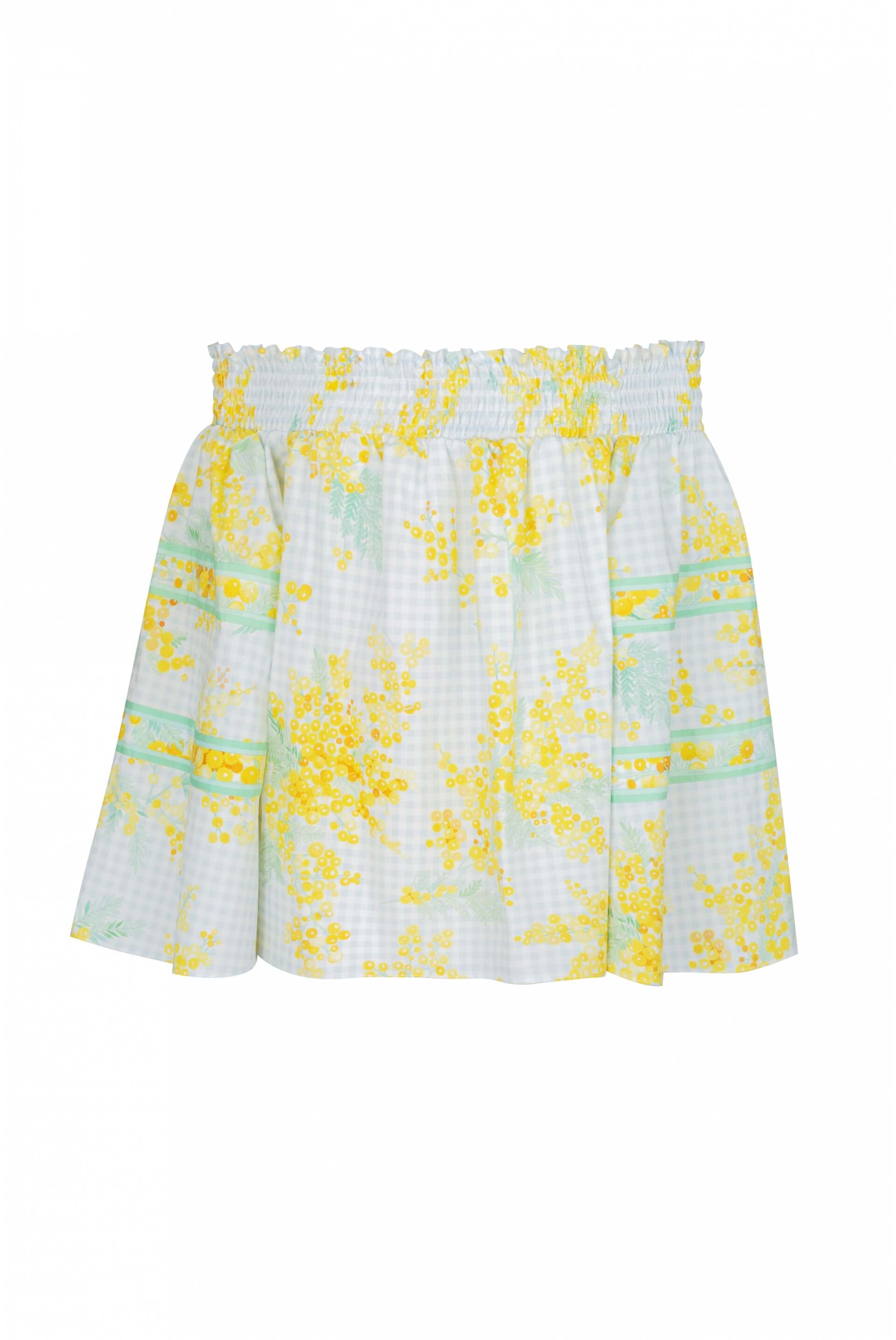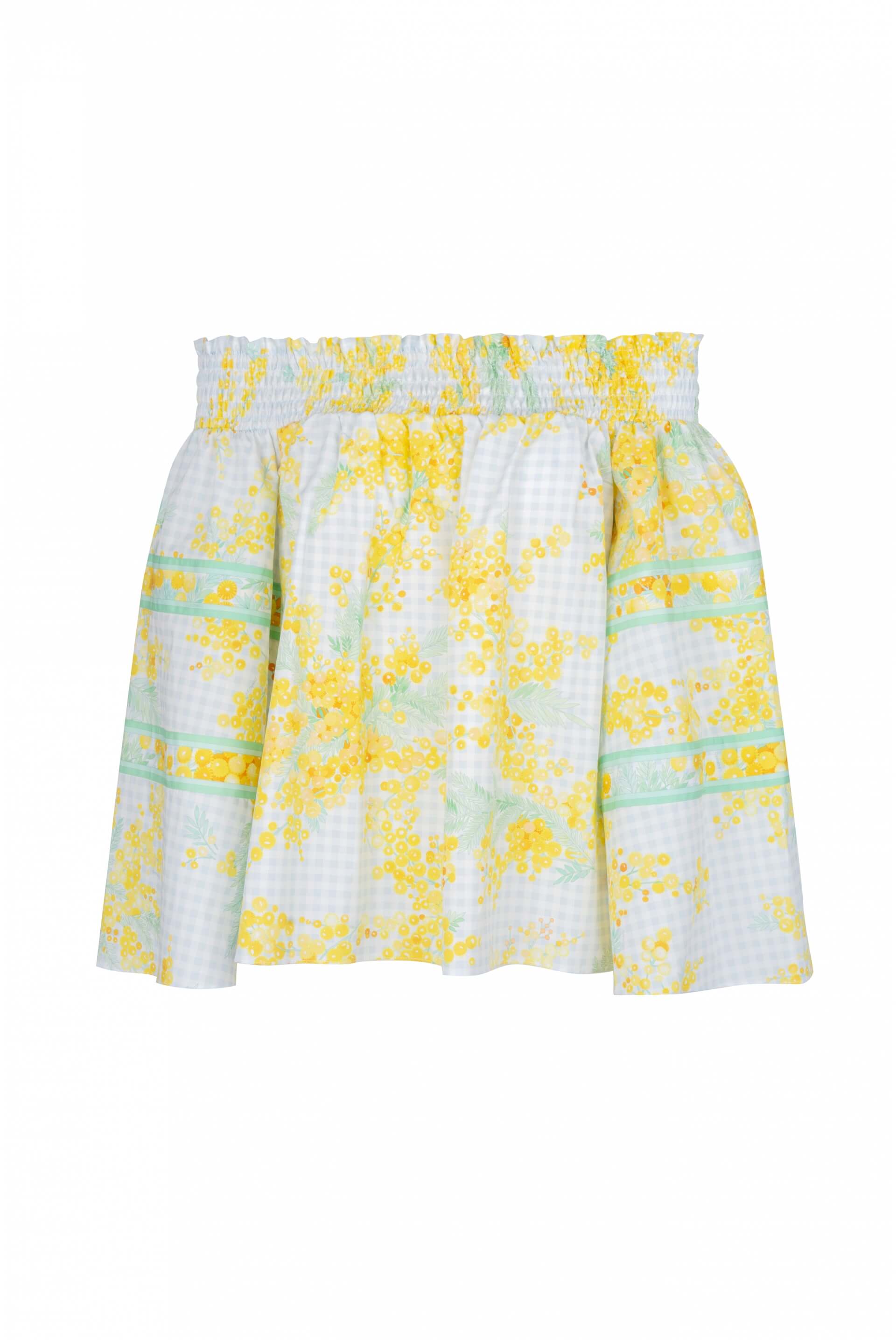 Top bustier à manches longues pagodes. Imprimé fleuri relevé de bandes emblématiques LEONARD sur les manches. Tailles françaises. Fabriqué en Italie.