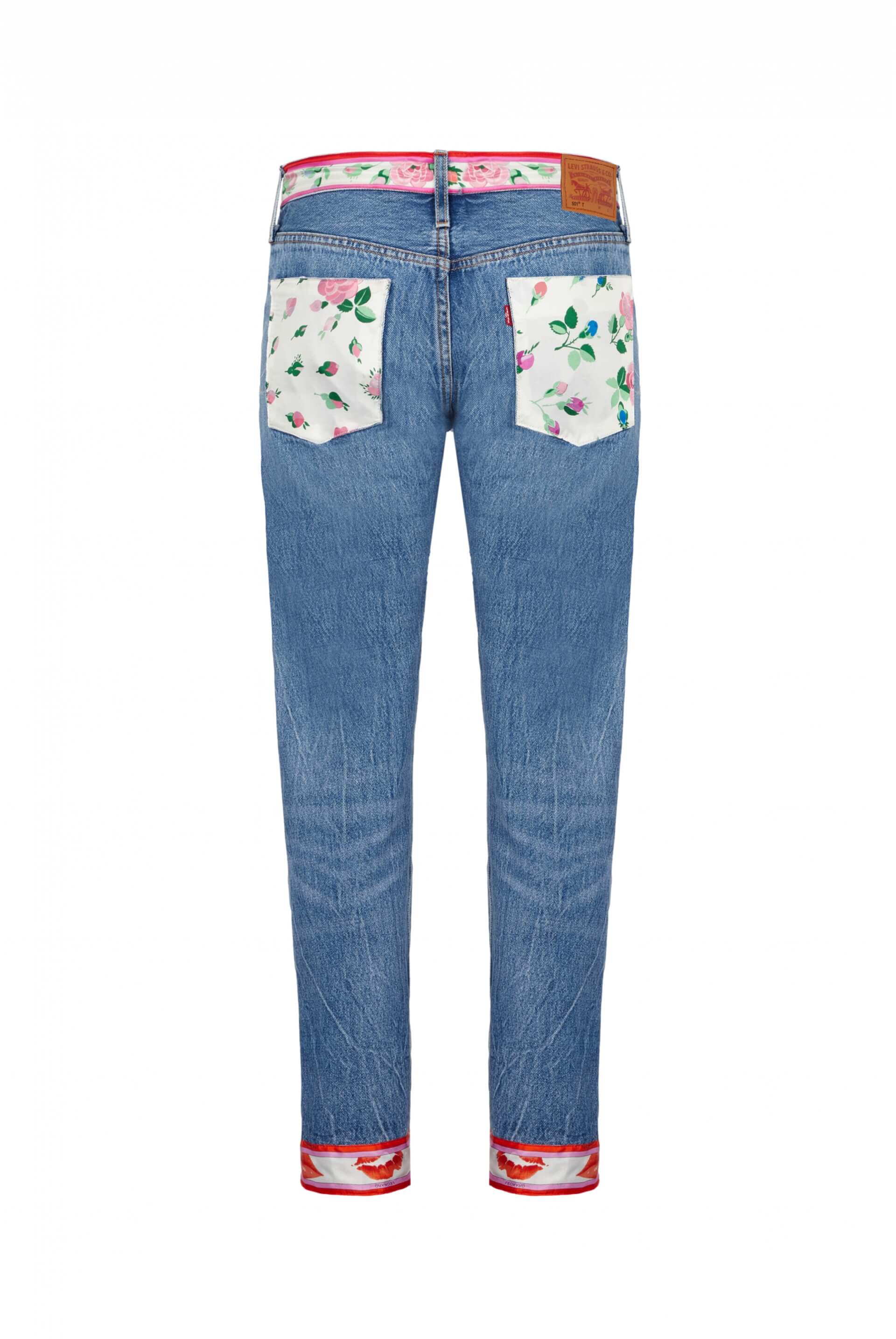 Jean upcycling. Pièce unique customisèe avec des tissus en jersey de soie issus des archives de la Maison Leonard. 100% Made In Paris.. Longueur : 94cm ; Tour de hanches : 82cm ; tour de taille (basse) : 70cm - Non stretch - 100% coton