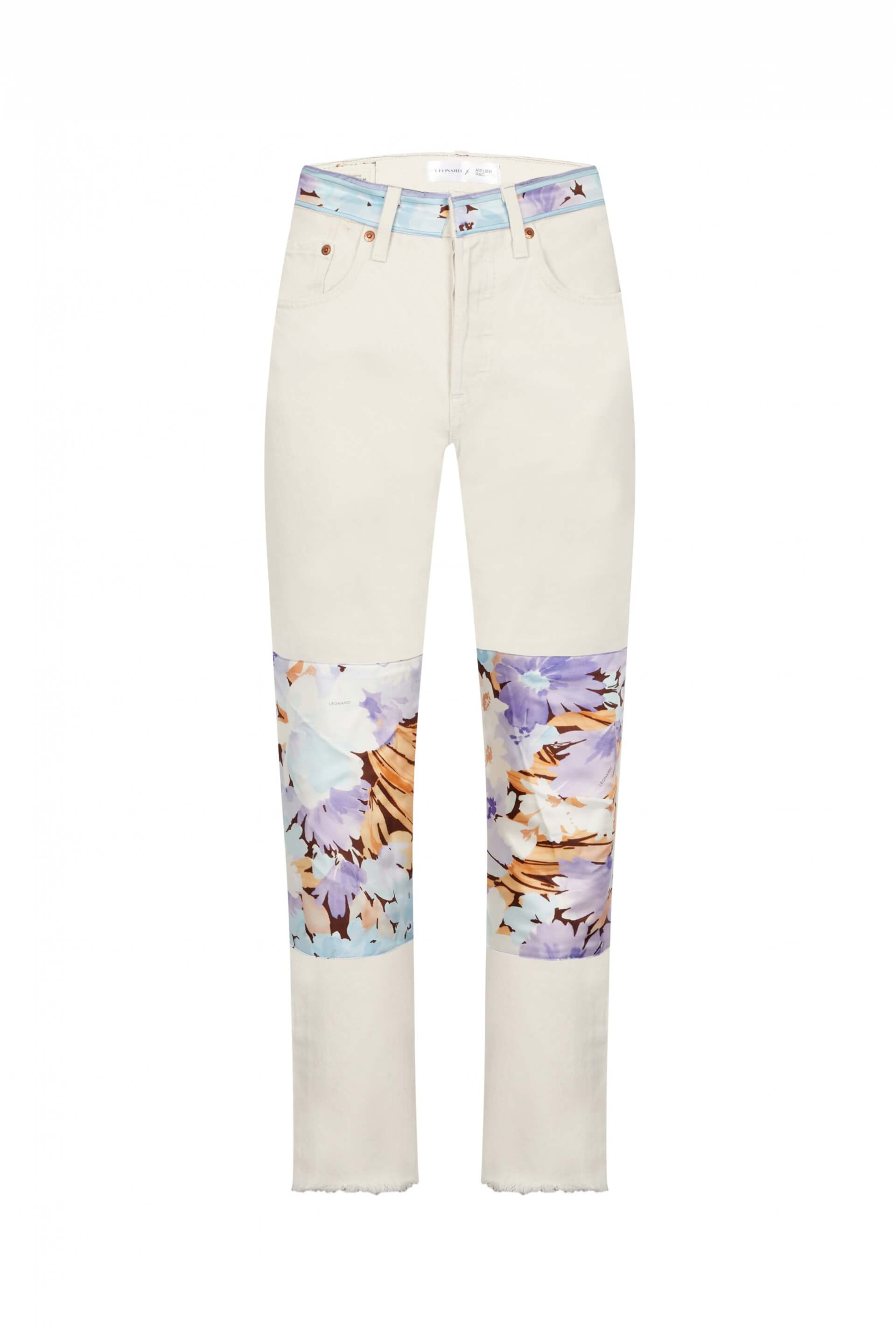 Jean upcycling. Pièce unique customisèe avec des tissus en jersey de soie issus des archives de la Maison Leonard. 100% Made In Paris. Longueur : 98cm ; Tour de hanches : 88cm ; tour de taille (basse) : 70cm - Non stretch - 100% coton
