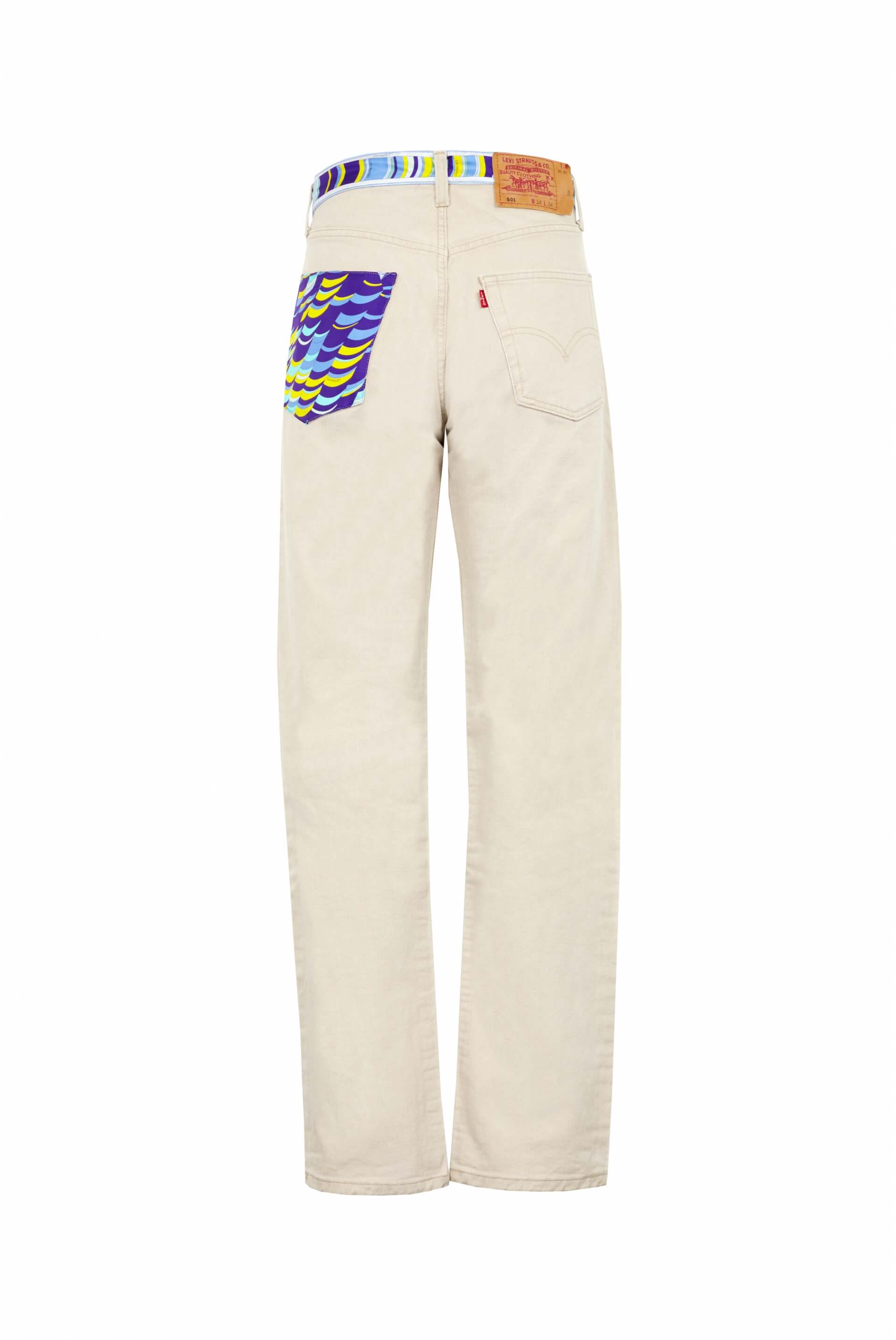 Jean upcycling. Pièce unique customisée avec des tissus en jersey de soie issus des archives de la Maison Leonard. 100% Made In Paris. Longueur : 113cm ; Tour de hanches : 100cm ; tour de taille (basse) : 84cm - Non stretch - 100% coton