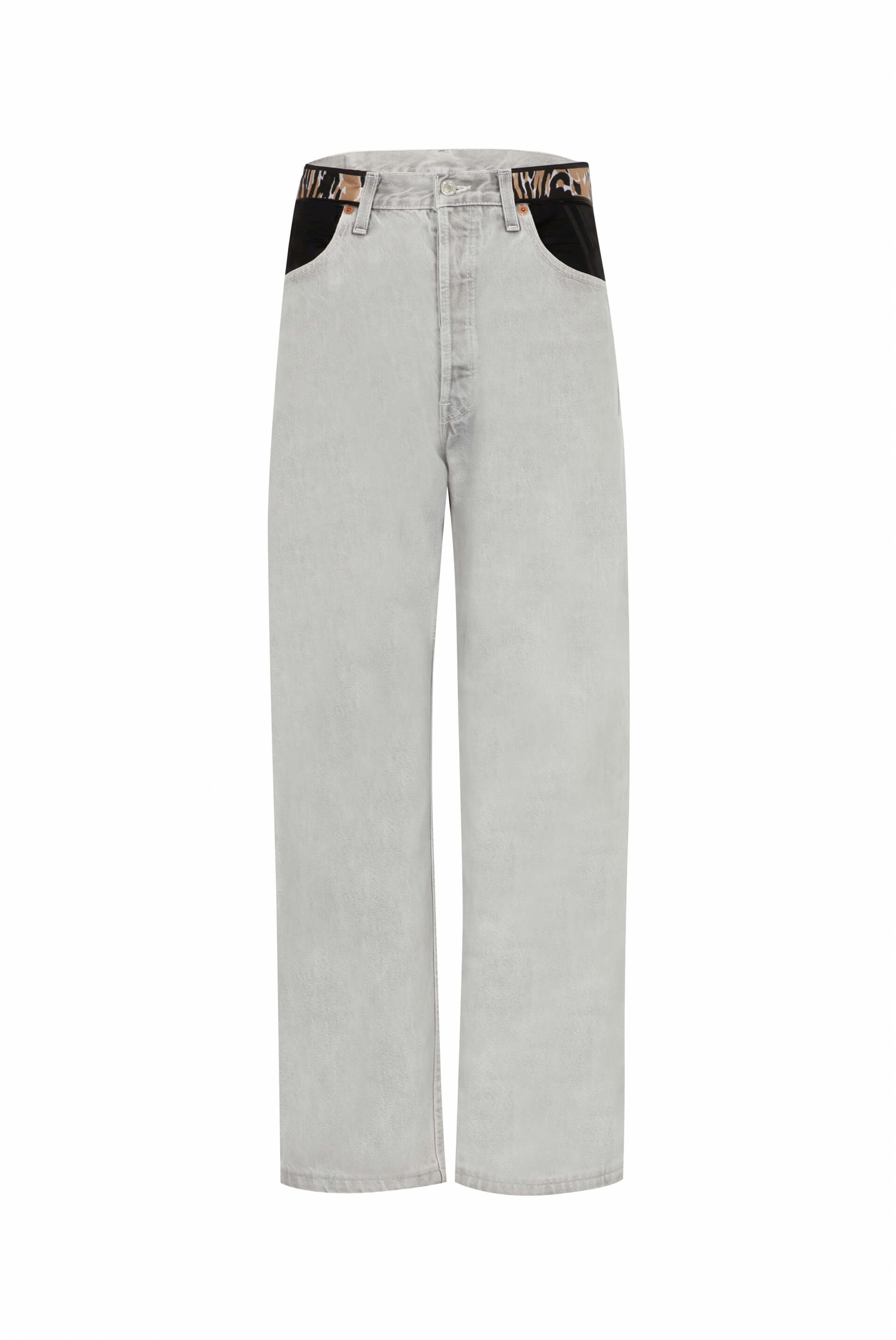 Jean upcycling. Pièce unique customisèe avec des tissus en jersey de soie issus des archives de la Maison Leonard. 100% Made In Paris. Longueur : 105cm ; Tour de hanches : 97cm ; tour de taille (basse) : 84cm - Non stretch - 100% coton