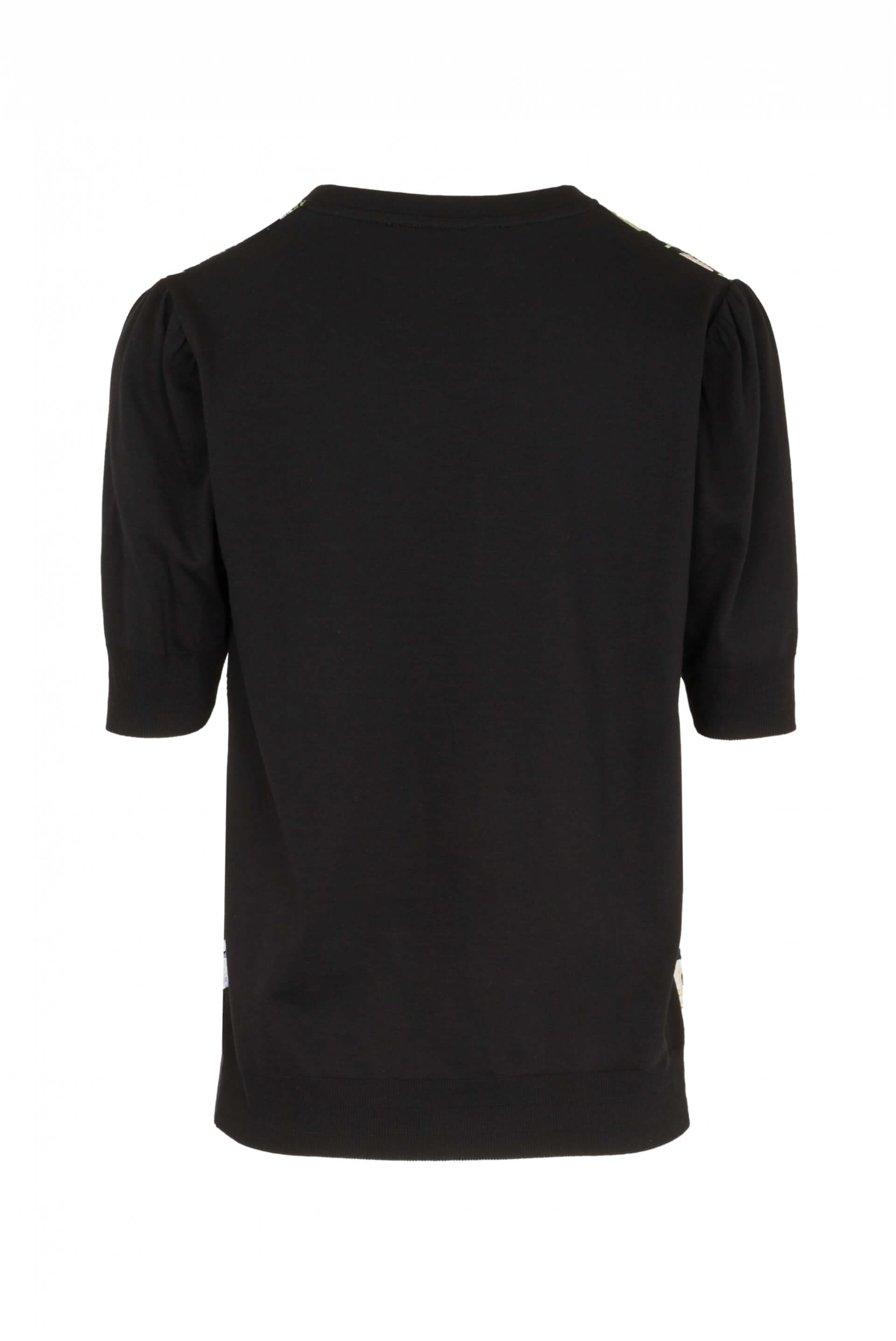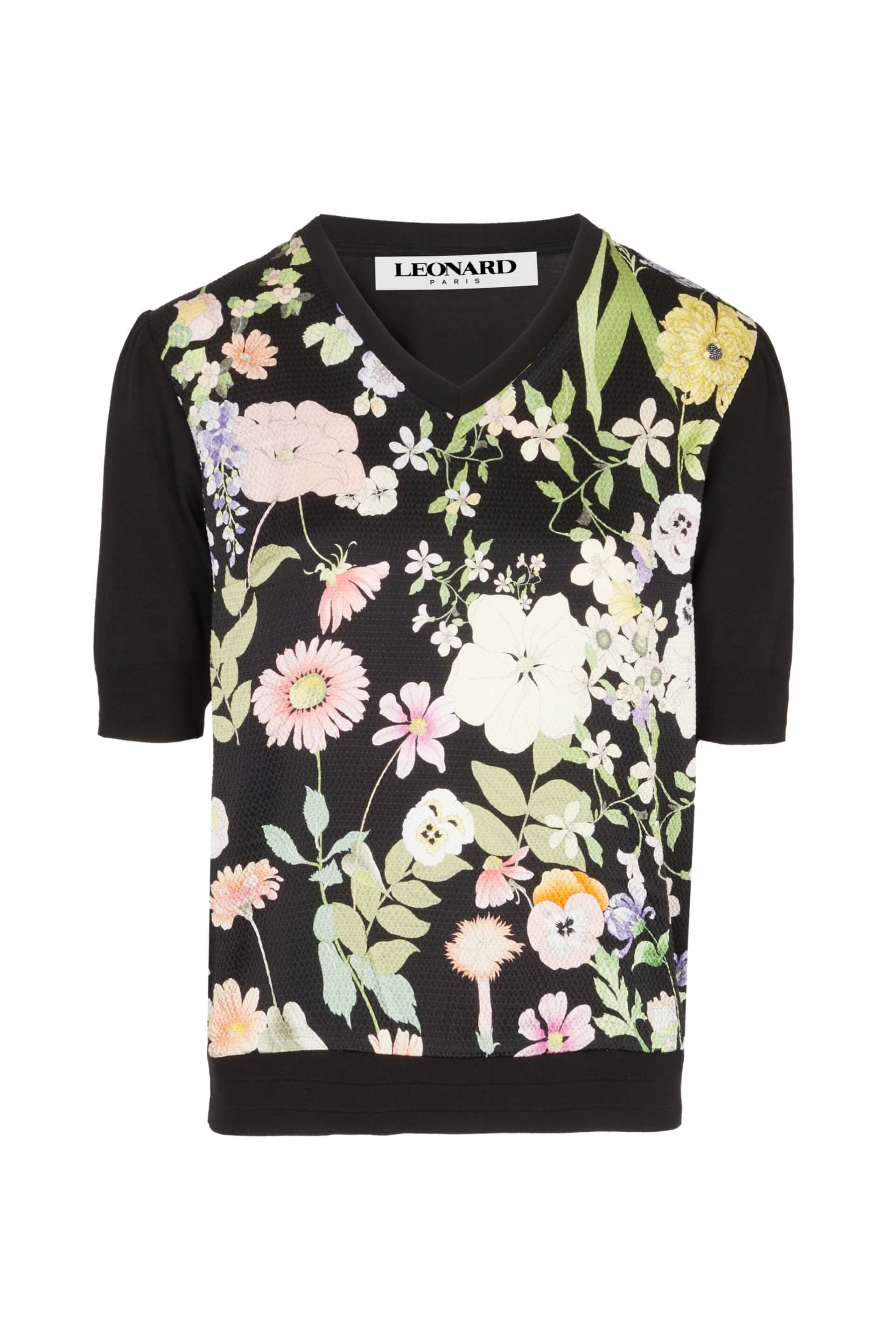 Top col V à manches courtes avec imprimé floral en polyamide et maille. Tailles françaises. Fabriqué en Italie.