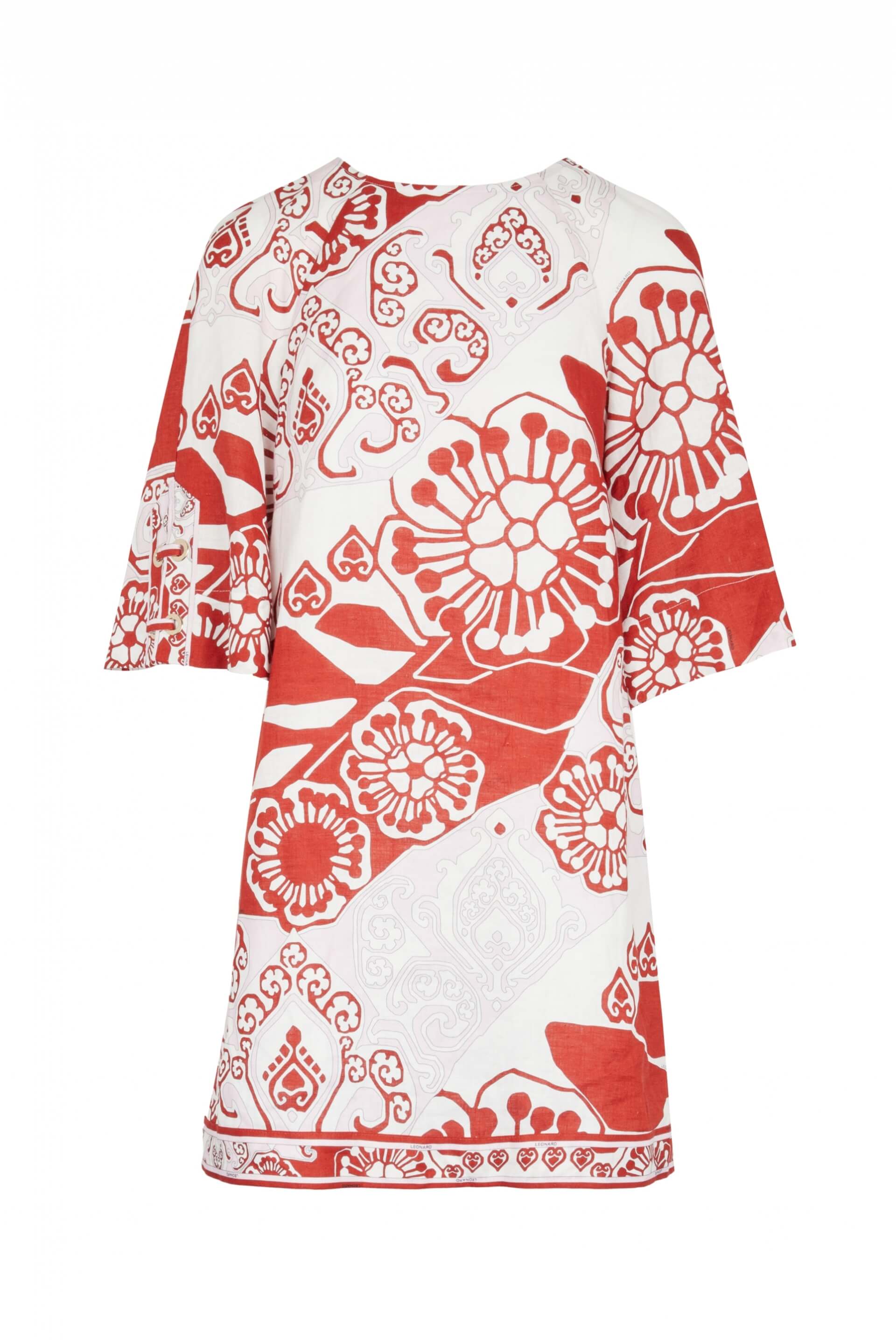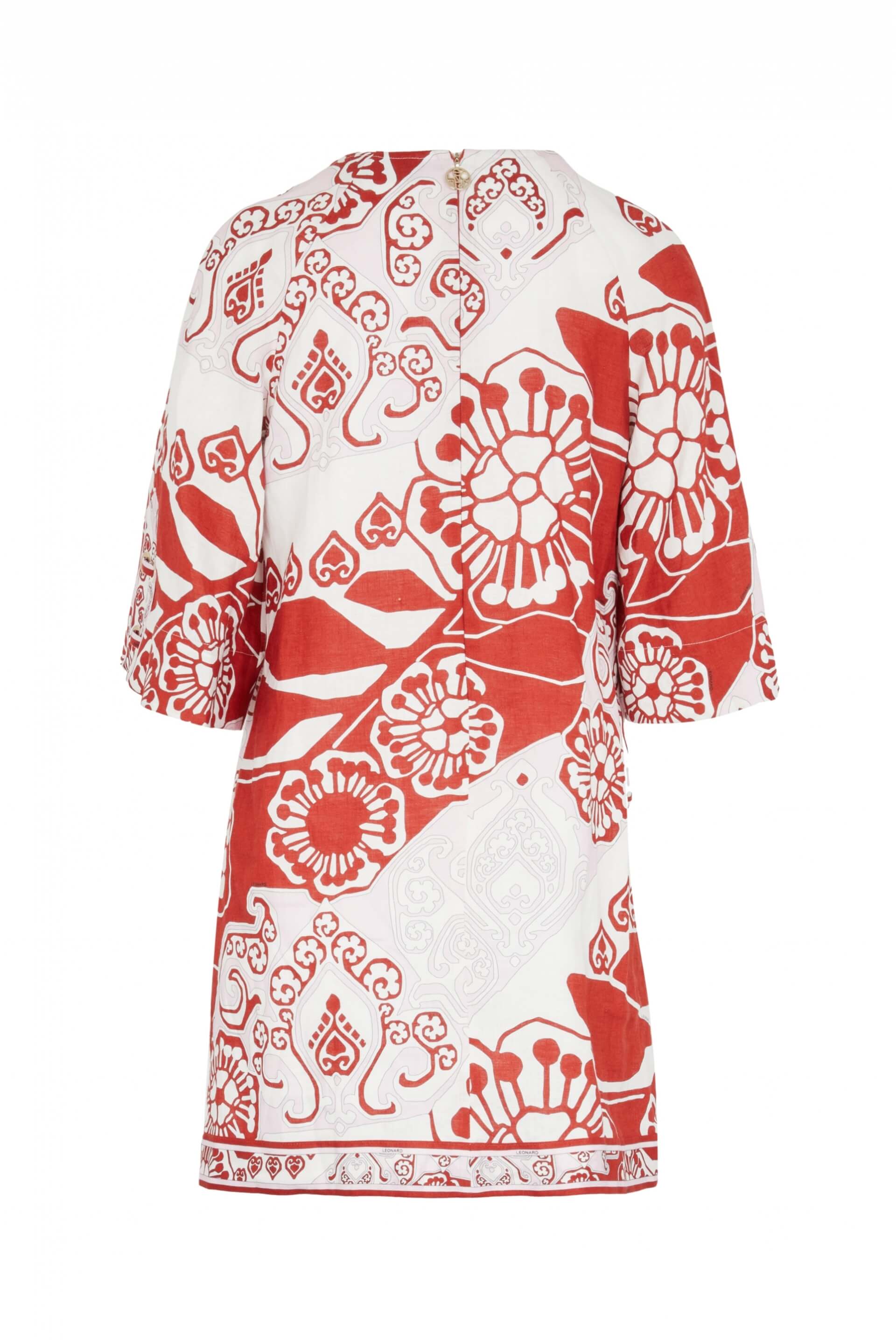 Robe courte trapèze avec manches 3/4 en lin. Fermeture éclair dans le dos. Longueur : 36-42 : 86 cm. Longueur : 44-48 : 90 cm. Tailles françaises. Fabriquée en Italie.